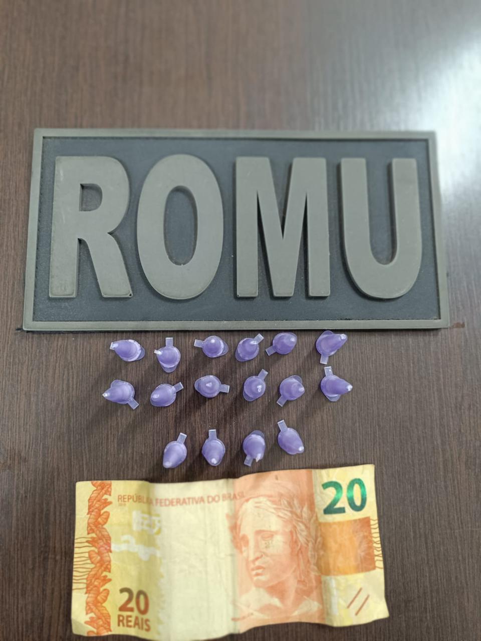 As equipes de Romu em patrulhamento ostensivo pelo bairro, próximo a dois estabelecimentos comerciais, local de intenso tráfico de entorpecentes, os guardas avistaram o adolescente, já conhecido nos meios policiais com conotações criminais pelo (Art-33), obtiveram êxito em flagrar o rapaz na área verde pegando o pino contendo uma substância no seu interior análoga à cocaína.