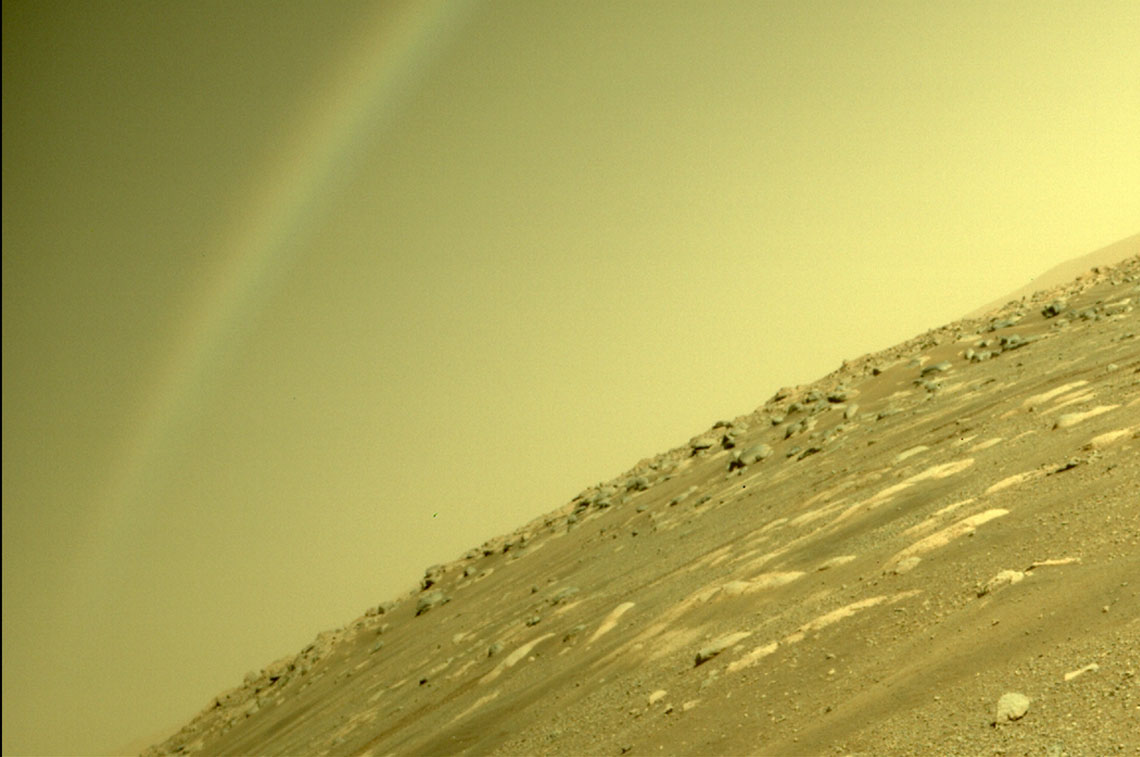Um fenômeno inusitado foi capturado pelo sonda robô Perseverance, da agência aeroespacial norte-americana Nasa, que explora desde fevereiro o solo marciano. Uma foto tirada pela Perseverance mostra um arco-íris no céu do planeta vermelho – algo considerado impossível, já que o fenômeno ocorre por causa da refração da luz solar nas partículas de água suspensas na atmosfera. Como Marte possui uma atmosfera fina e gelada, não há possibilidade de haver água em estado líquido circulando livremente pelo ar.