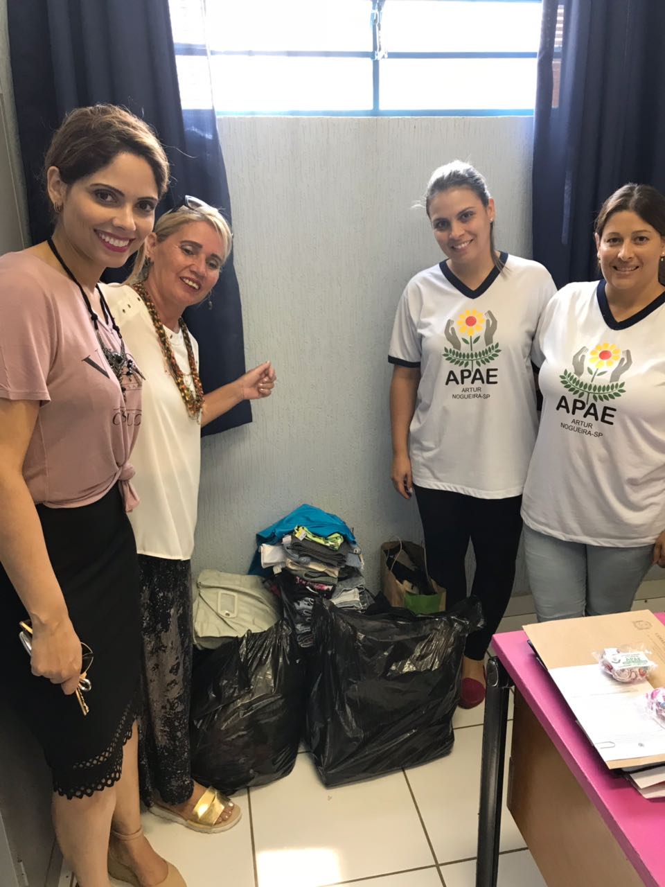 As roupas que sobraram do bazar foi divididas e entregues a Aidan, Projeto Arco-Íris, Apae de Artur Nogueira e ao Grupo de Assistência Social de Artur Nogueira.