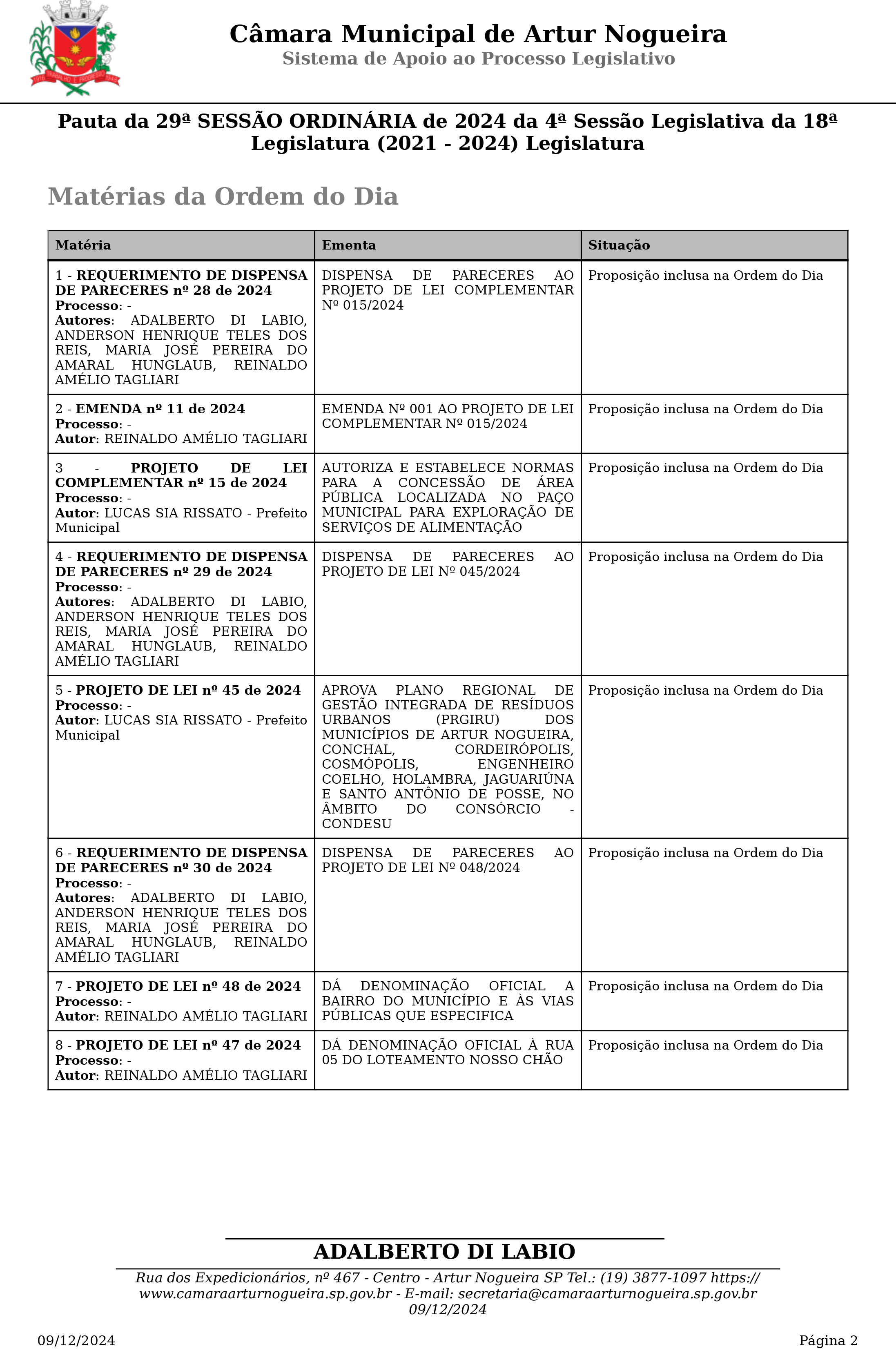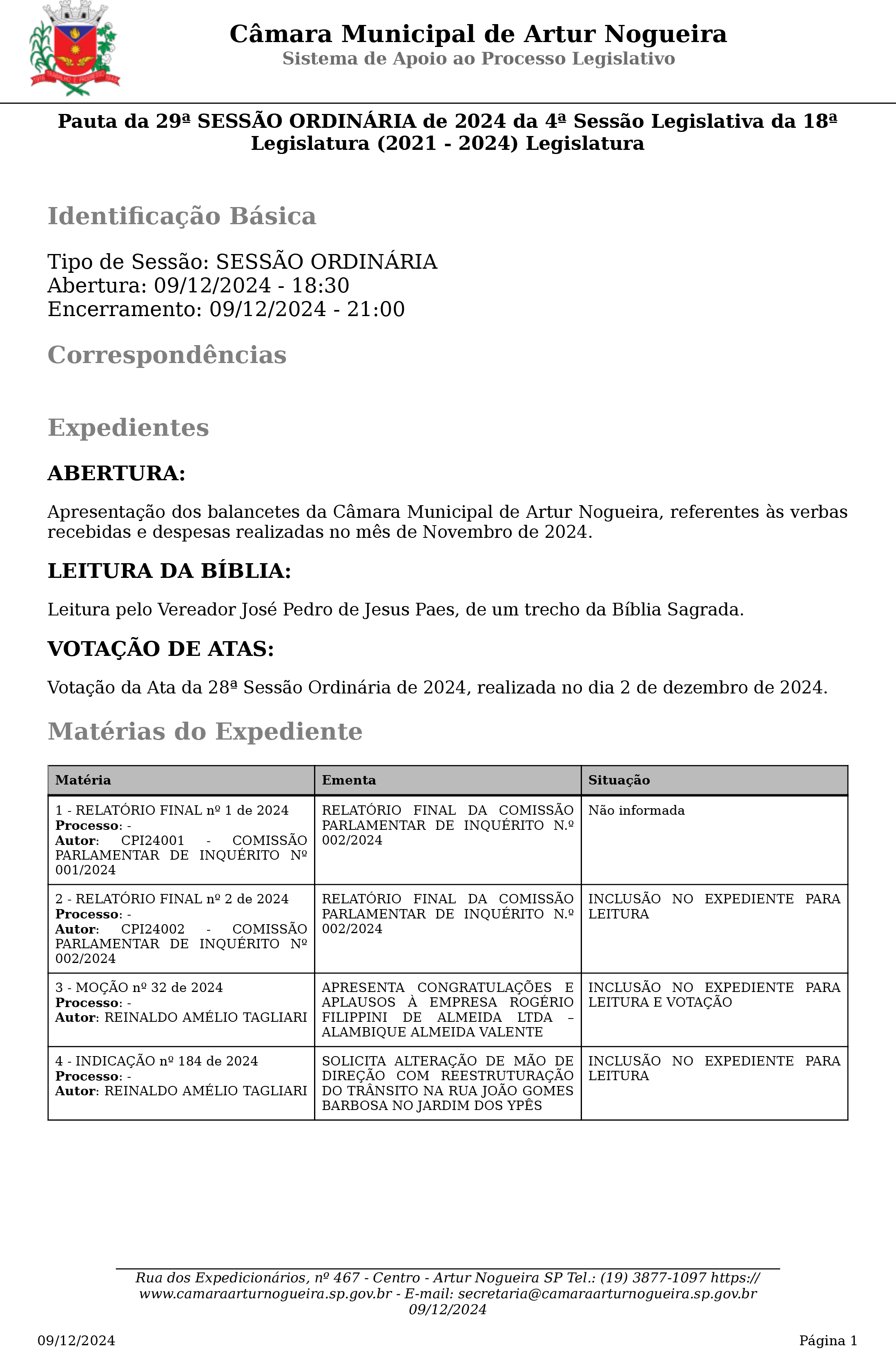 Artur Nogueira Nesta segunda-feira (9), será realizada a 29ª sessão ordinária de 2024, marcando a última sessão ordinária do ano. O encerramento das atividades legislativas do ano na Casa termina no dia 15. A sessão terá início às 18h30.