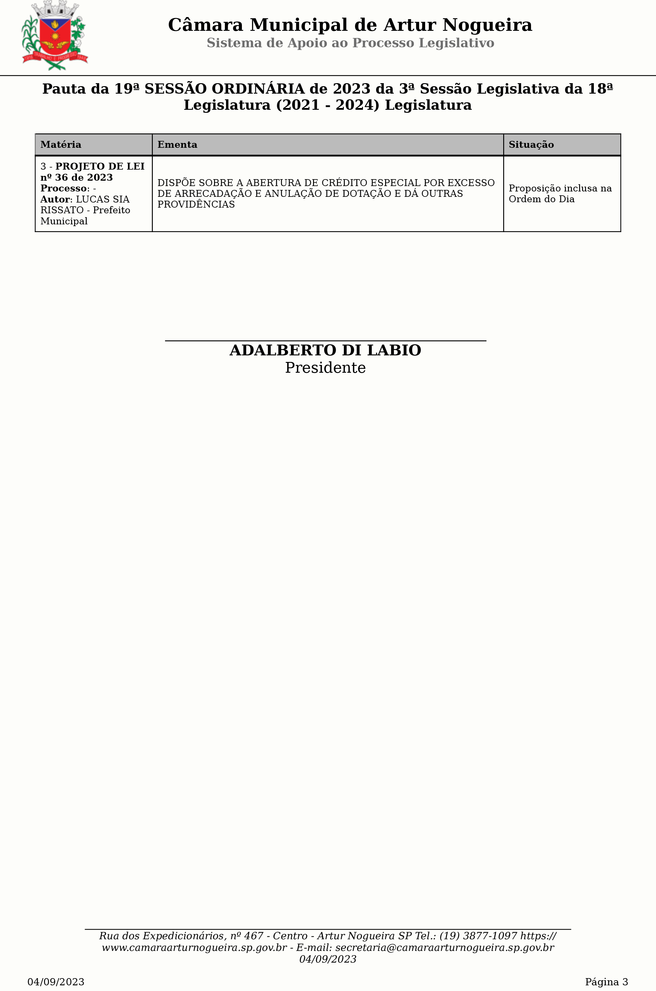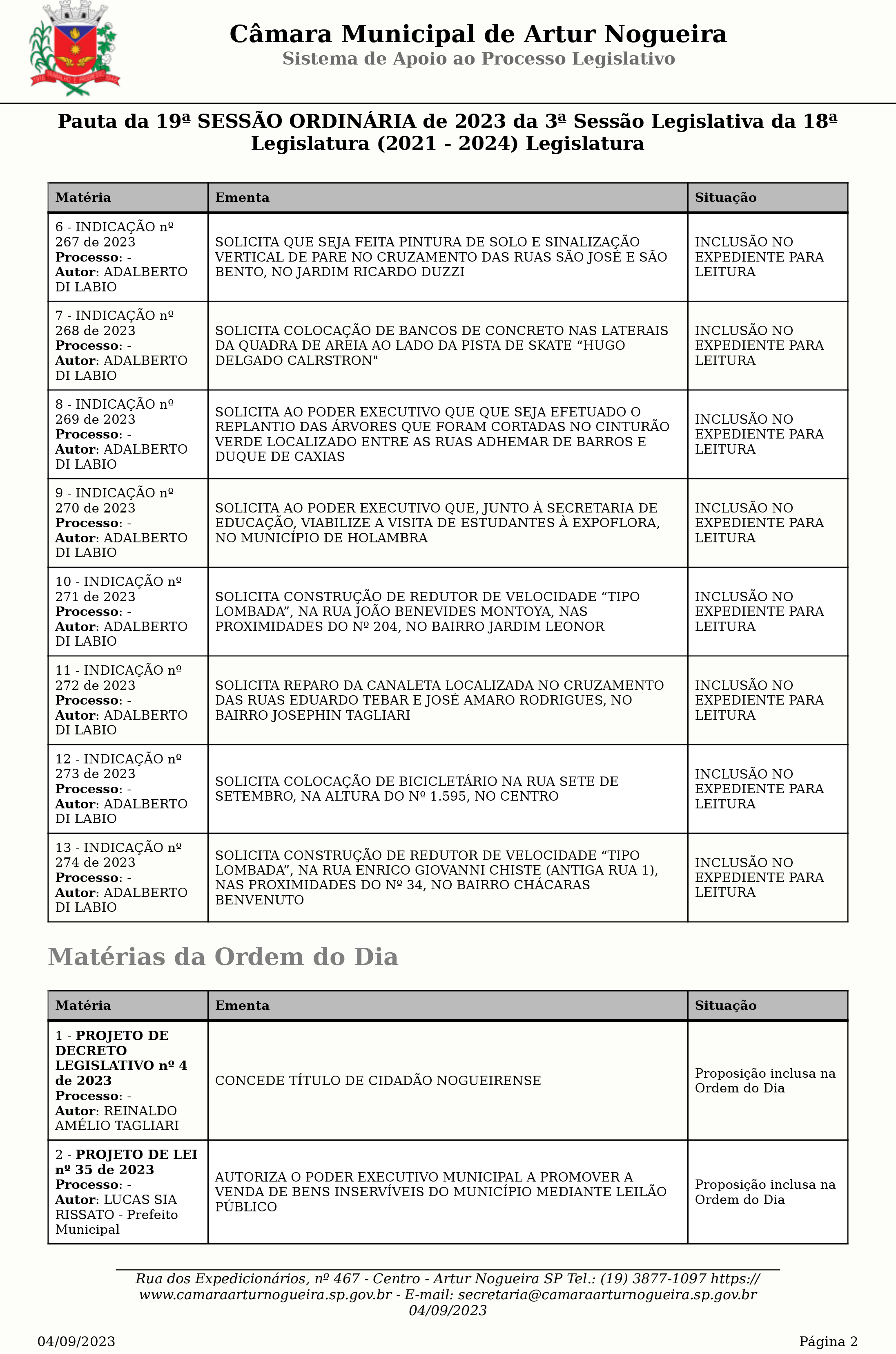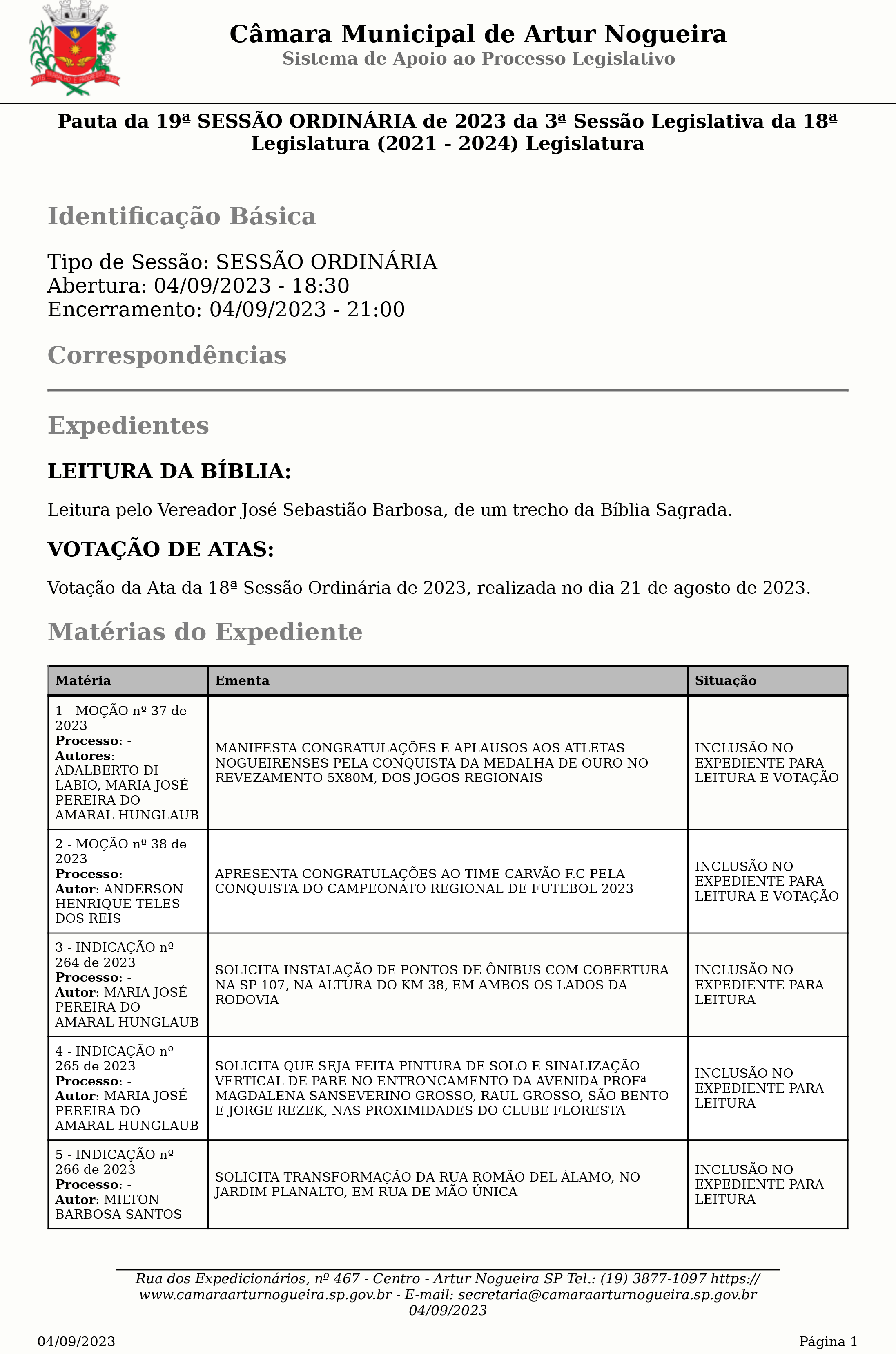 A 19ª sessão ordinária da Câmara Municipal de Artur Nogueira acontece hoje (04), às 18h30. O público também poderá acompanhar a transmissão pelo site da Casa Legislativa ou pelo Correio Nogueirense.