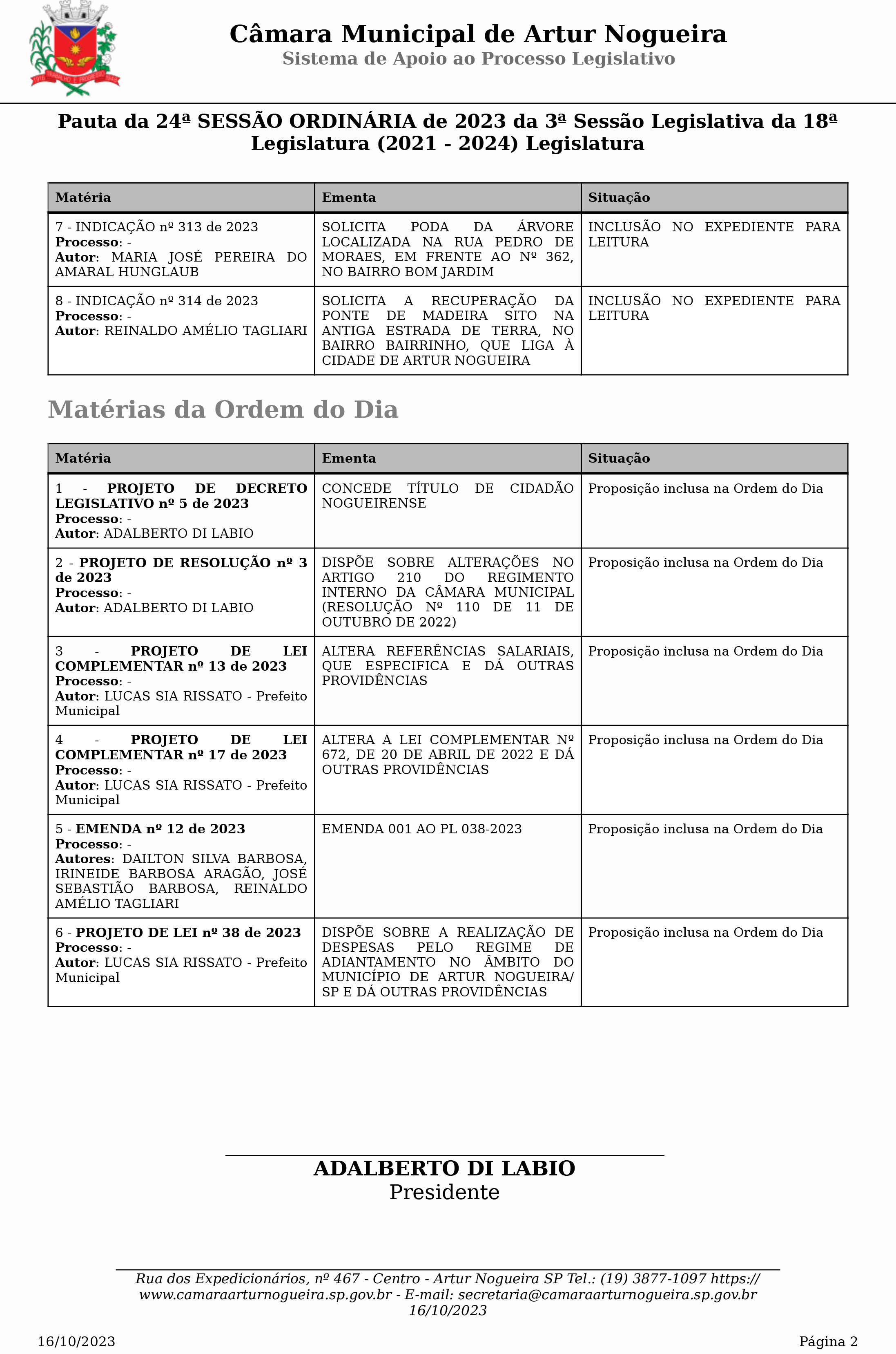A 24ª sessão ordinária da Câmara Municipal de Artur Nogueira acontece hoje (16), às 18h30. O público também poderá acompanhar a transmissão pelo site da Casa Legislativa ou pelo Correio Nogueirense.