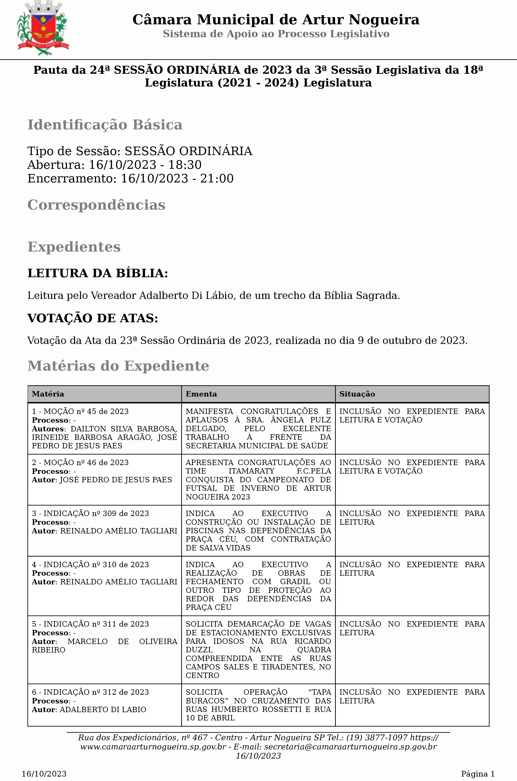 A 24ª sessão ordinária da Câmara Municipal de Artur Nogueira acontece hoje (16), às 18h30. O público também poderá acompanhar a transmissão pelo site da Casa Legislativa ou pelo Correio Nogueirense.