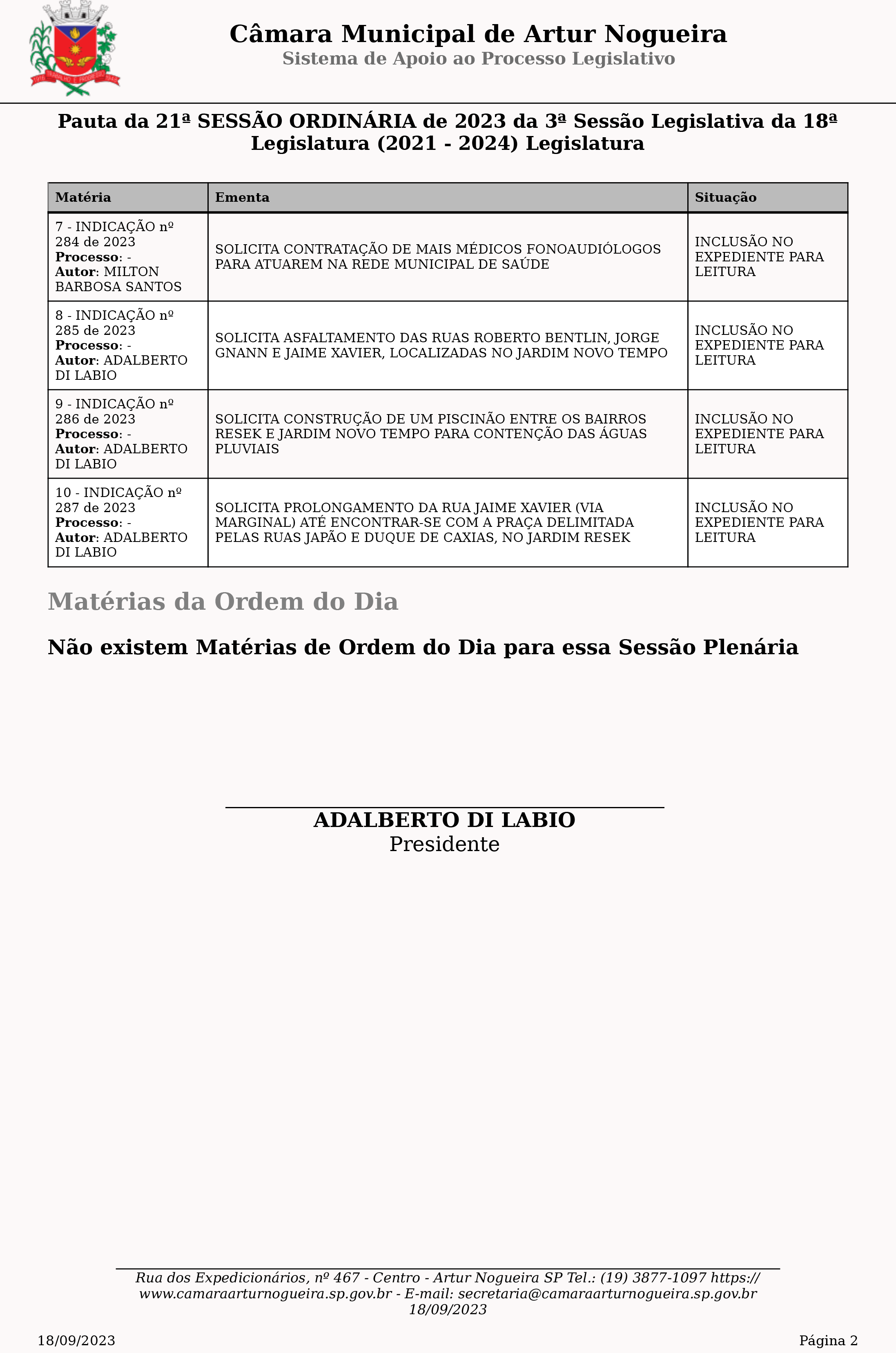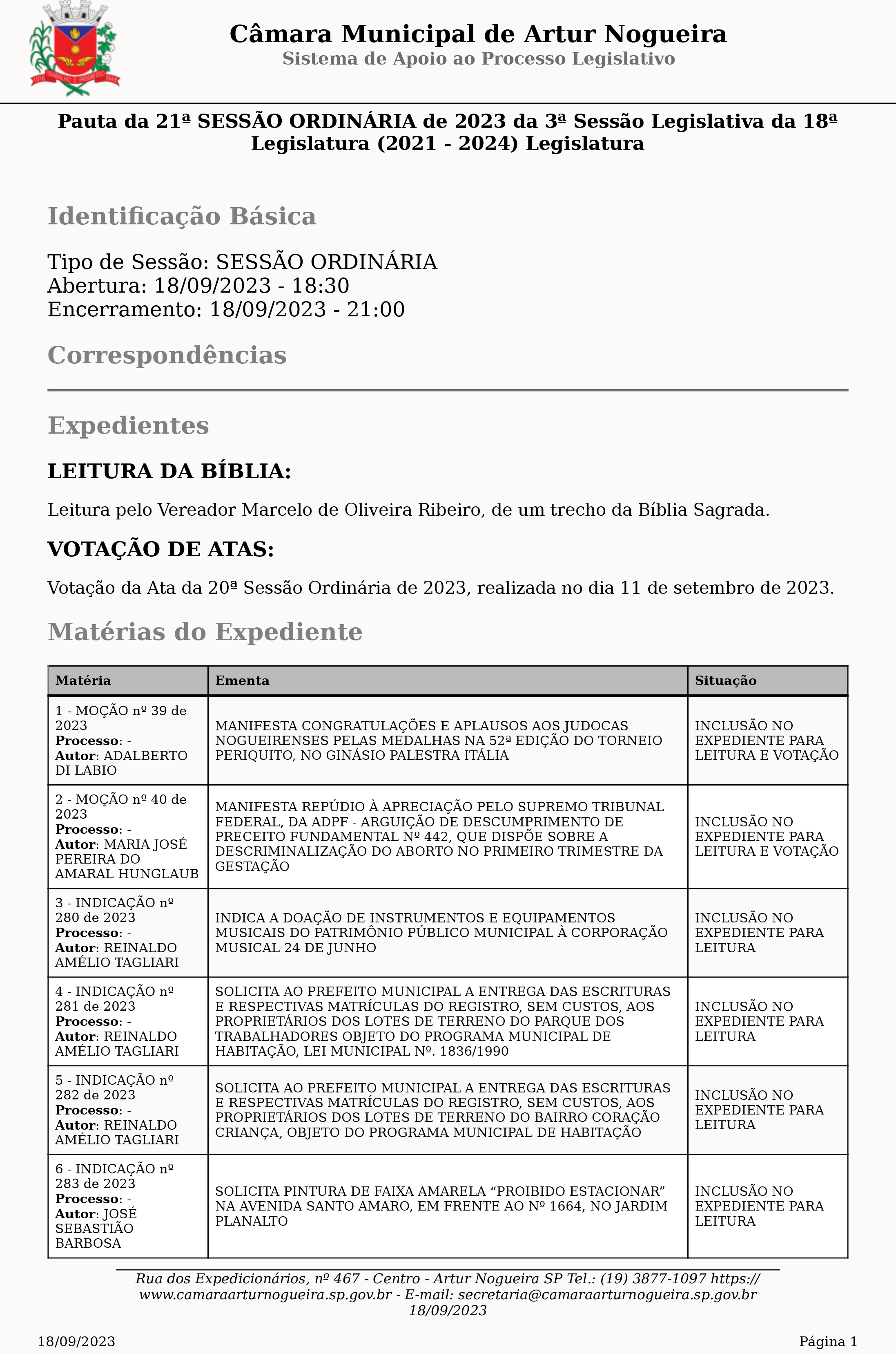 A 21ª sessão ordinária da Câmara Municipal de Artur Nogueira acontece hoje (18), às 18h30. O público também poderá acompanhar a transmissão pelo site da Casa Legislativa ou pelo Correio Nogueirense.