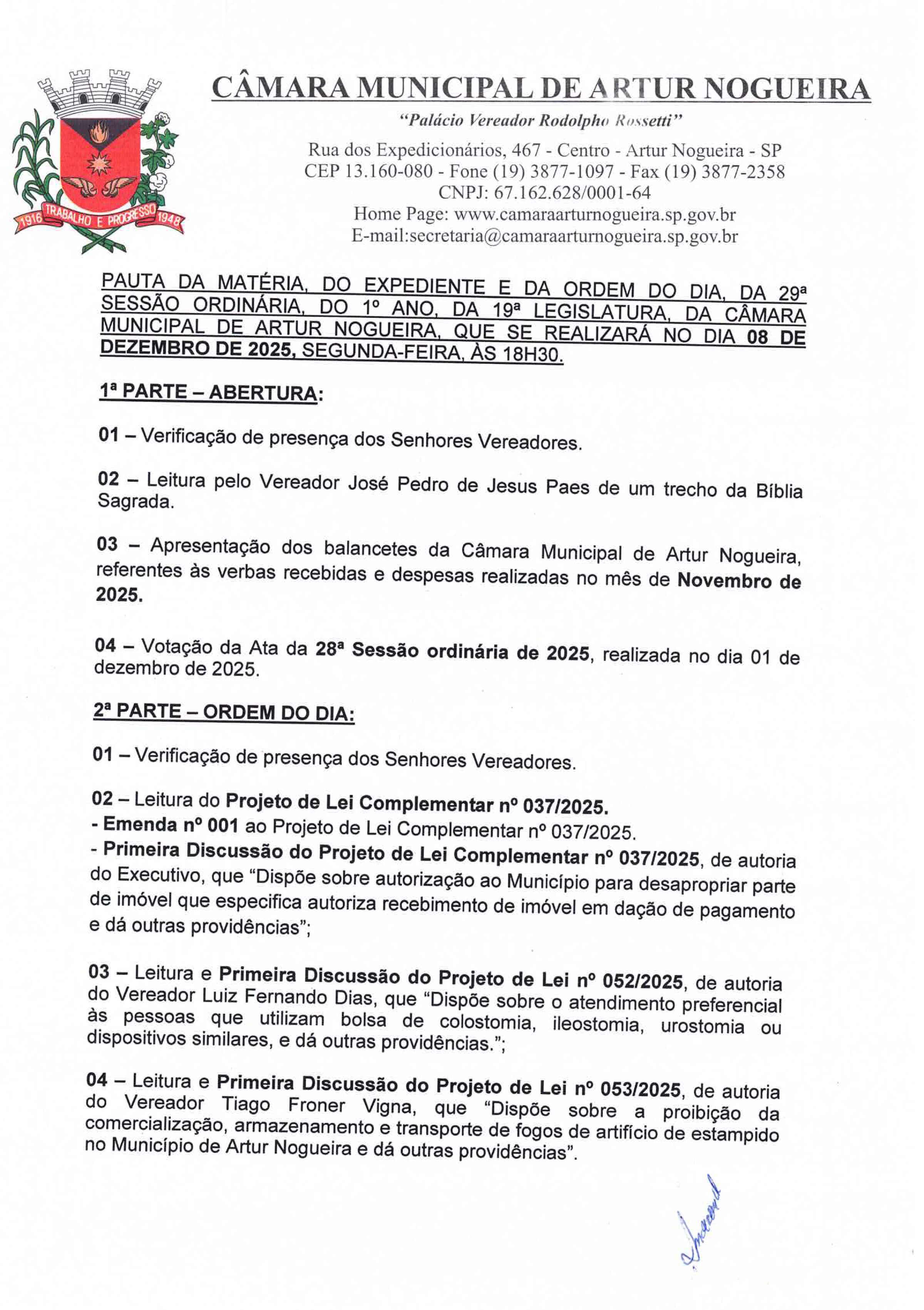 A Câmara Municipal de Artur Nogueira realiza nesta segunda-feira (8), às 18h30, a 29ª Sessão Ordinária de 2025. A reunião marca mais um encontro do Legislativo e contará com apresentação de balancetes, leitura de projetos e encaminhamento de novas indicações ao Executivo.