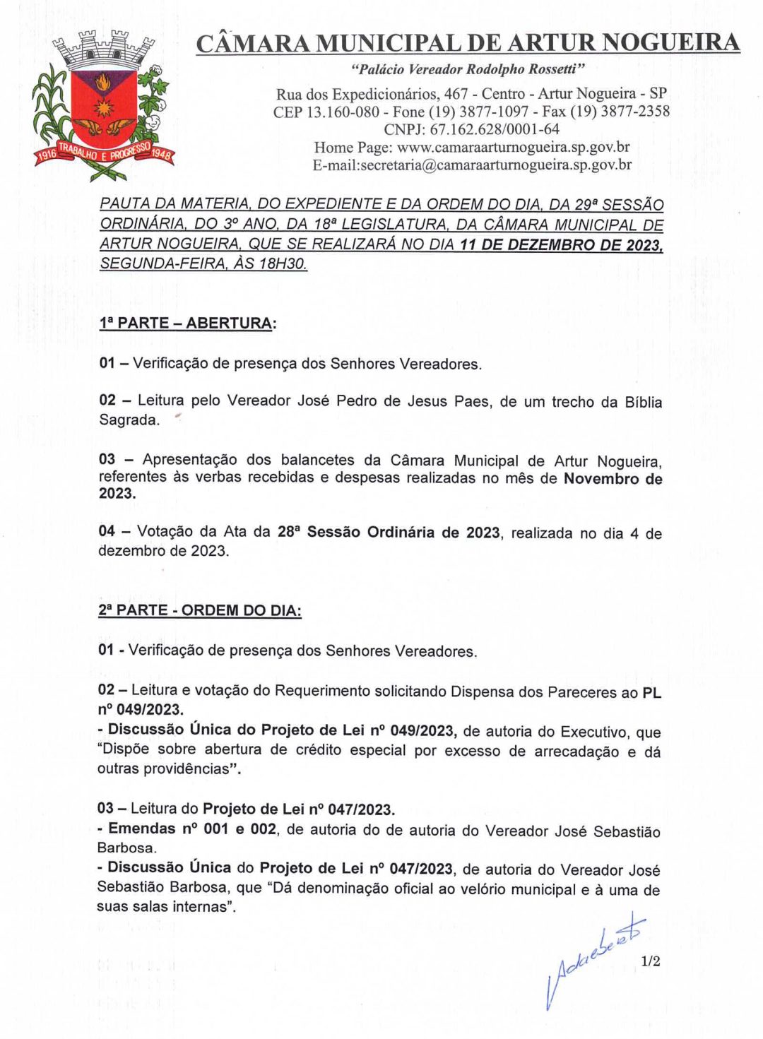 A 29ª sessão ordinária da Câmara Municipal de Artur Nogueira acontece hoje (11), às 18h30. O público também poderá acompanhar a transmissão pelo site da Casa Legislativa ou pelo Correio Nogueirense.