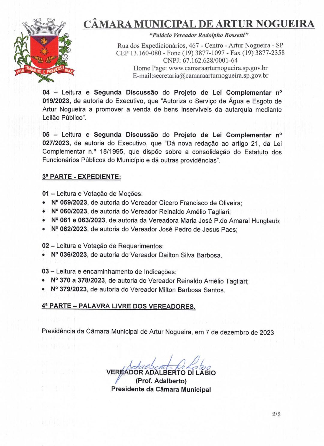 A pauta conta com leitura e votação de Moção e leitura e encaminhamento de Indicações, leitura de Projeto de Lei e Projeto de Lei Complementar e leitura e encaminhamento de requerimento.
