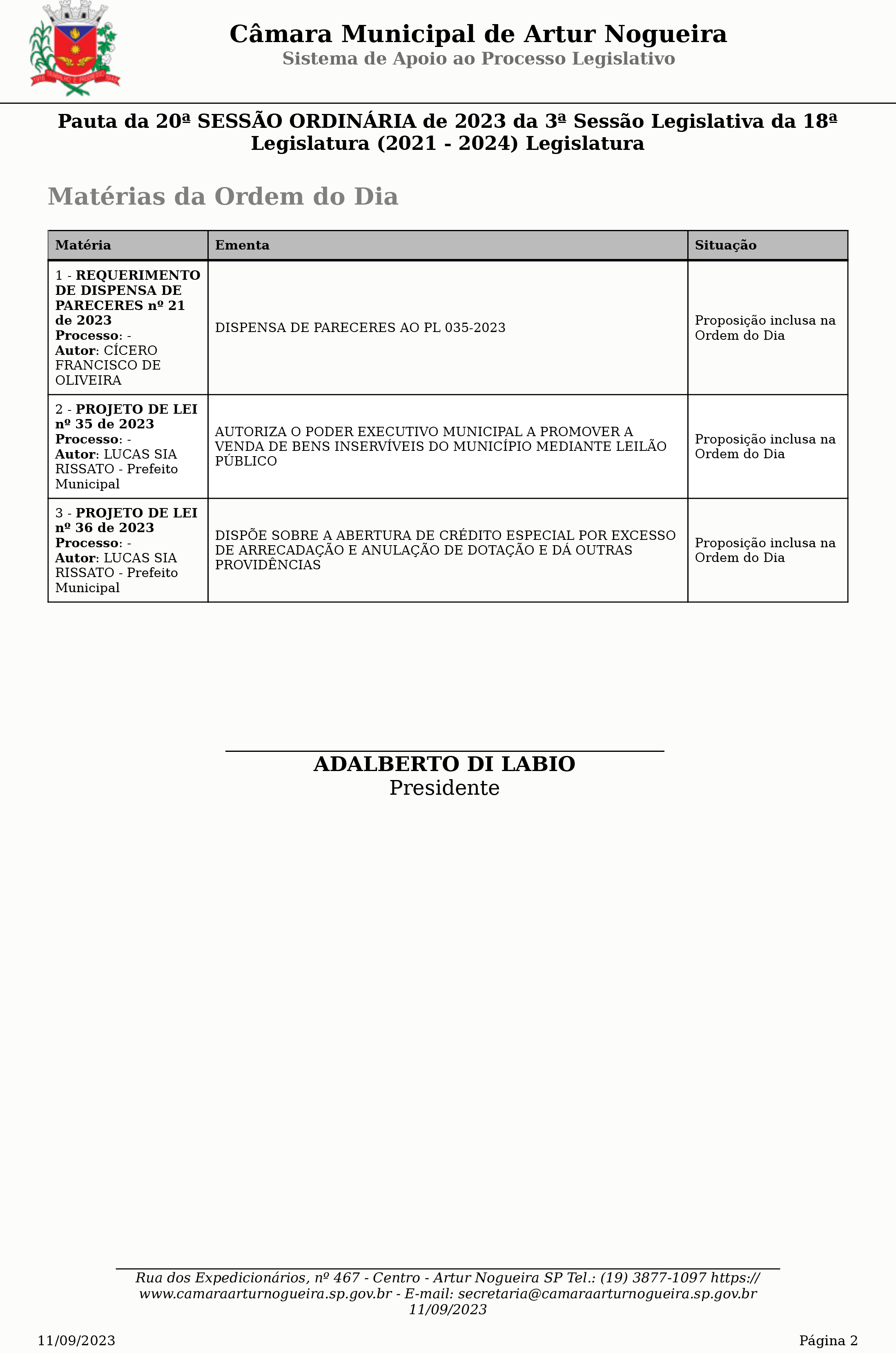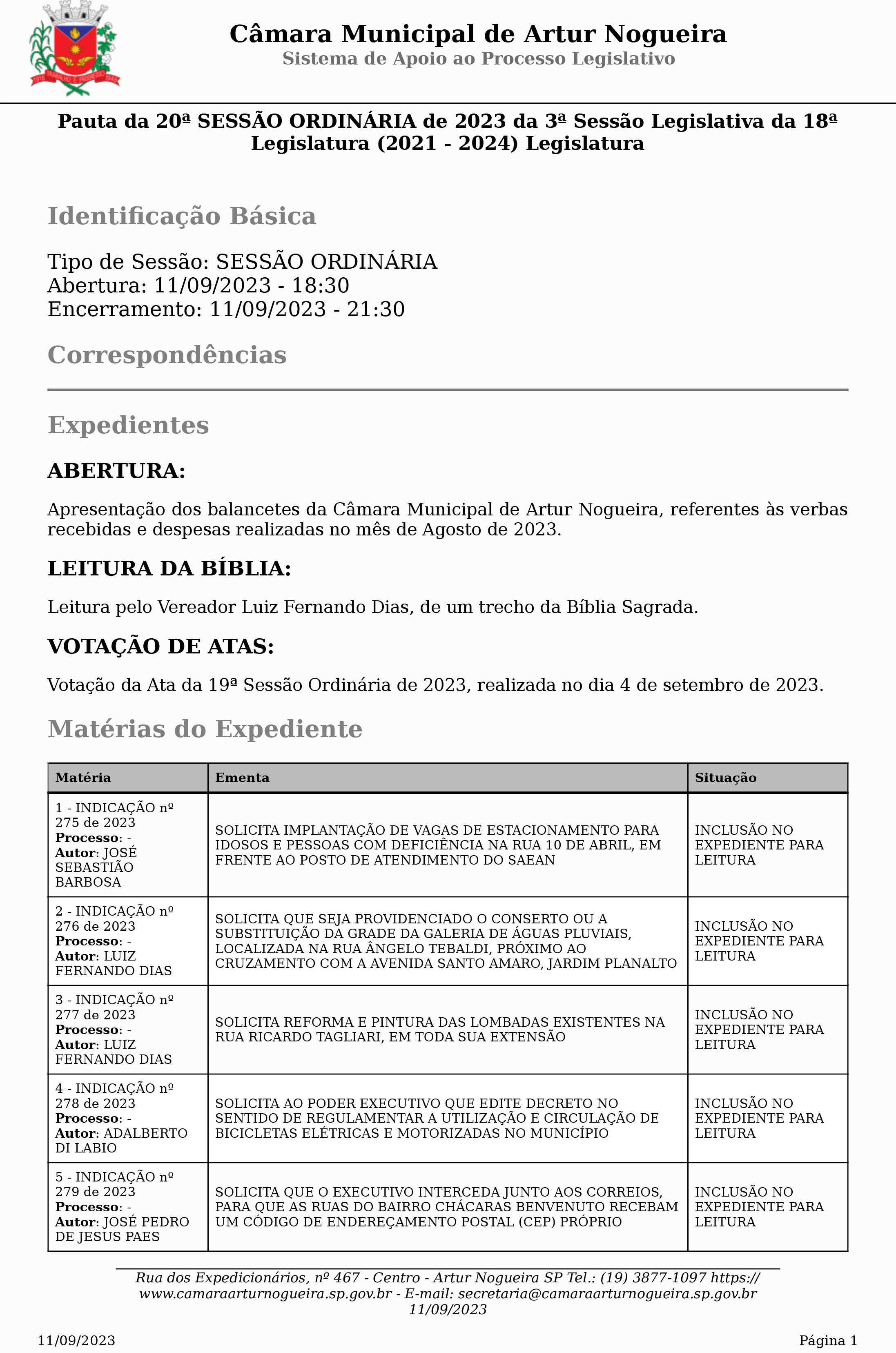 A 20ª sessão ordinária da Câmara Municipal de Artur Nogueira acontece hoje (11), às 18h30. O público também poderá acompanhar a transmissão pelo site da Casa Legislativa ou pelo Correio Nogueirense.