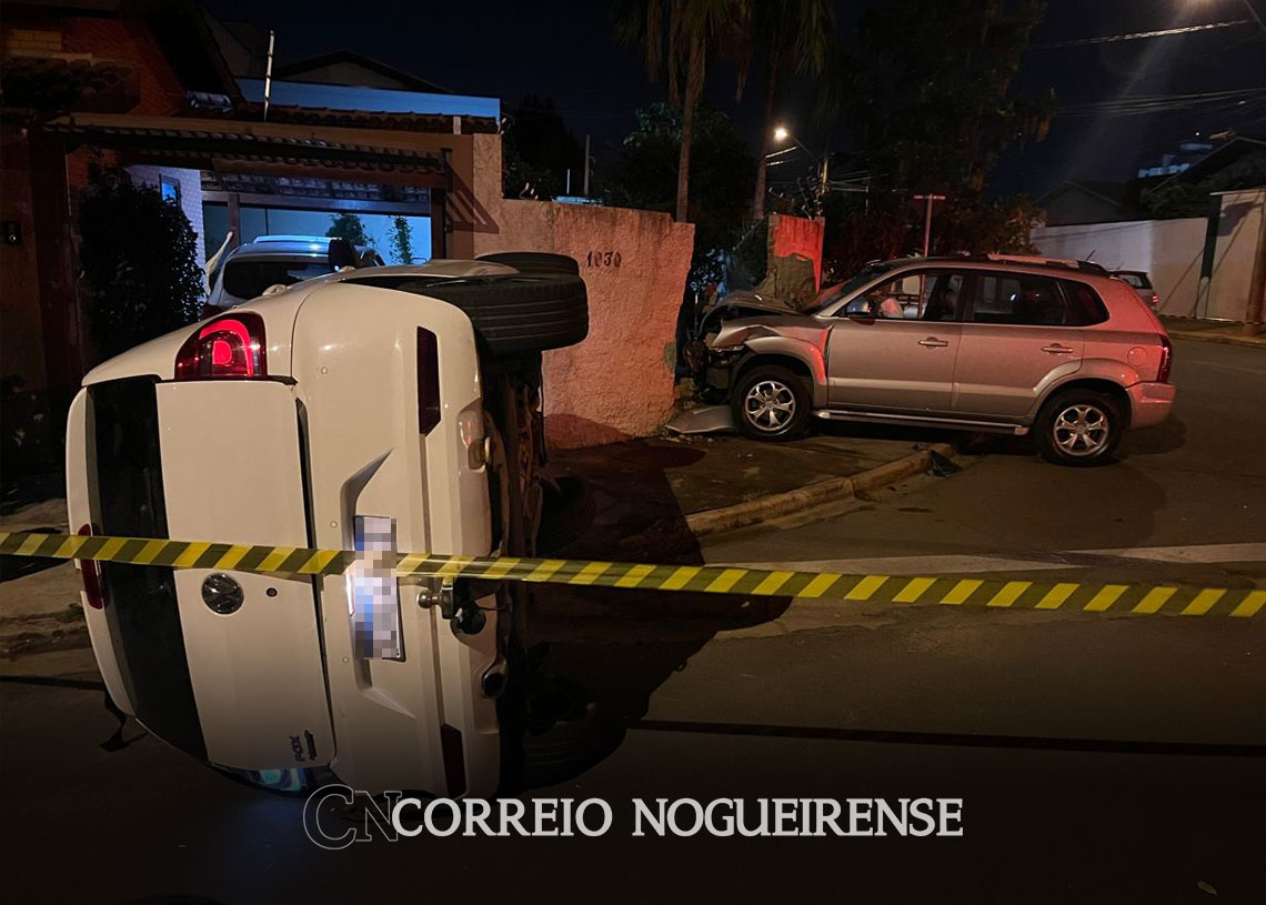 Um veículo Volkswagen Fox estava tombado na rua, já o condutor daHyundai Tucson perdeu o controle e bateu contra um muro. O caso aconteceu na esquina da Rua Raul Grosso com a Rua Maria Simões de Andrade. A polícia não informou qual foi a dinâmica do acidente.