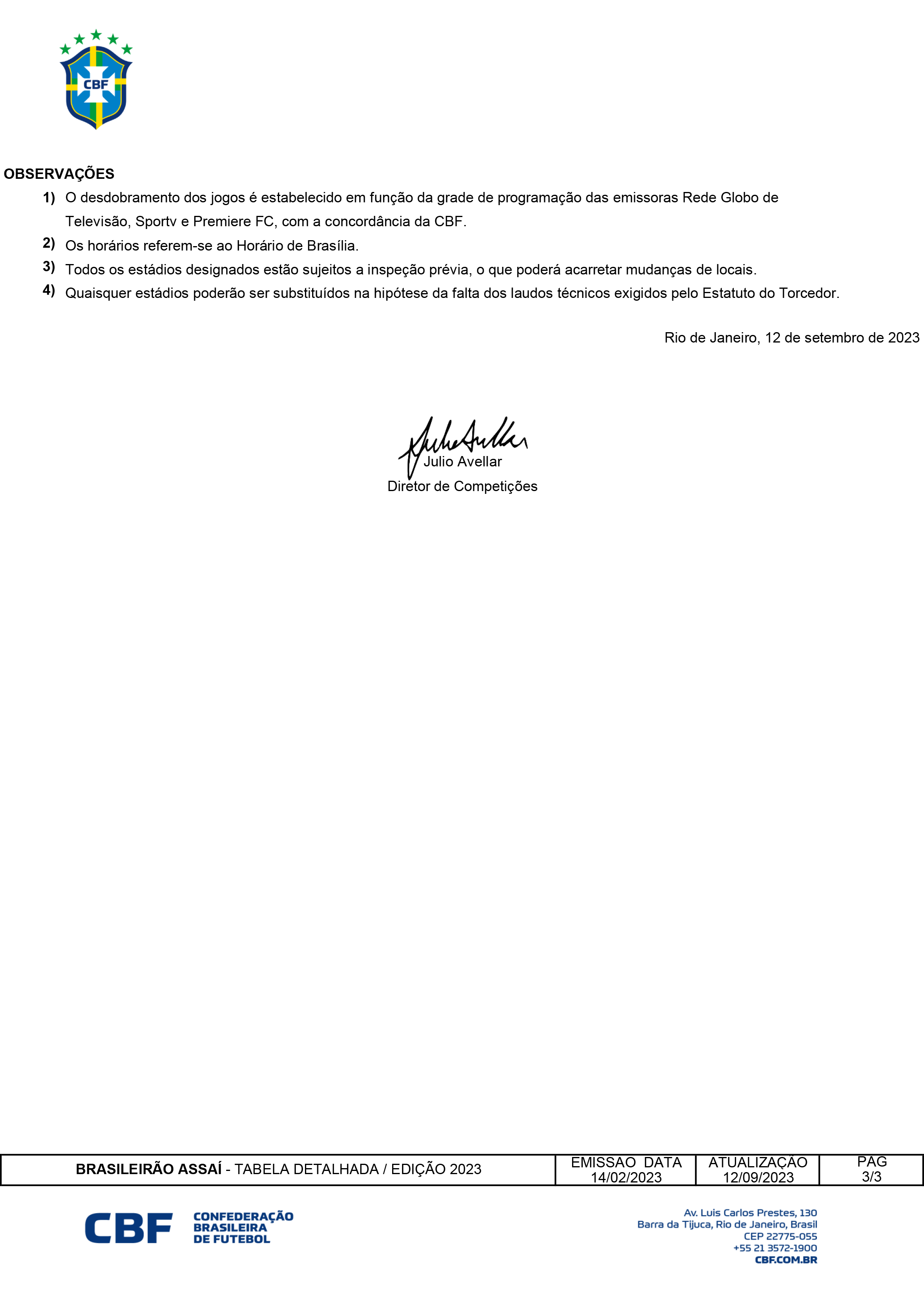 A Confederação Brasileira de Futebol (CBF) divulgou, nesta terça (12), a tabela detalhada do Brasileirão Assaí 2023. O documento define a sequência do campeonato até a 29ª rodada.