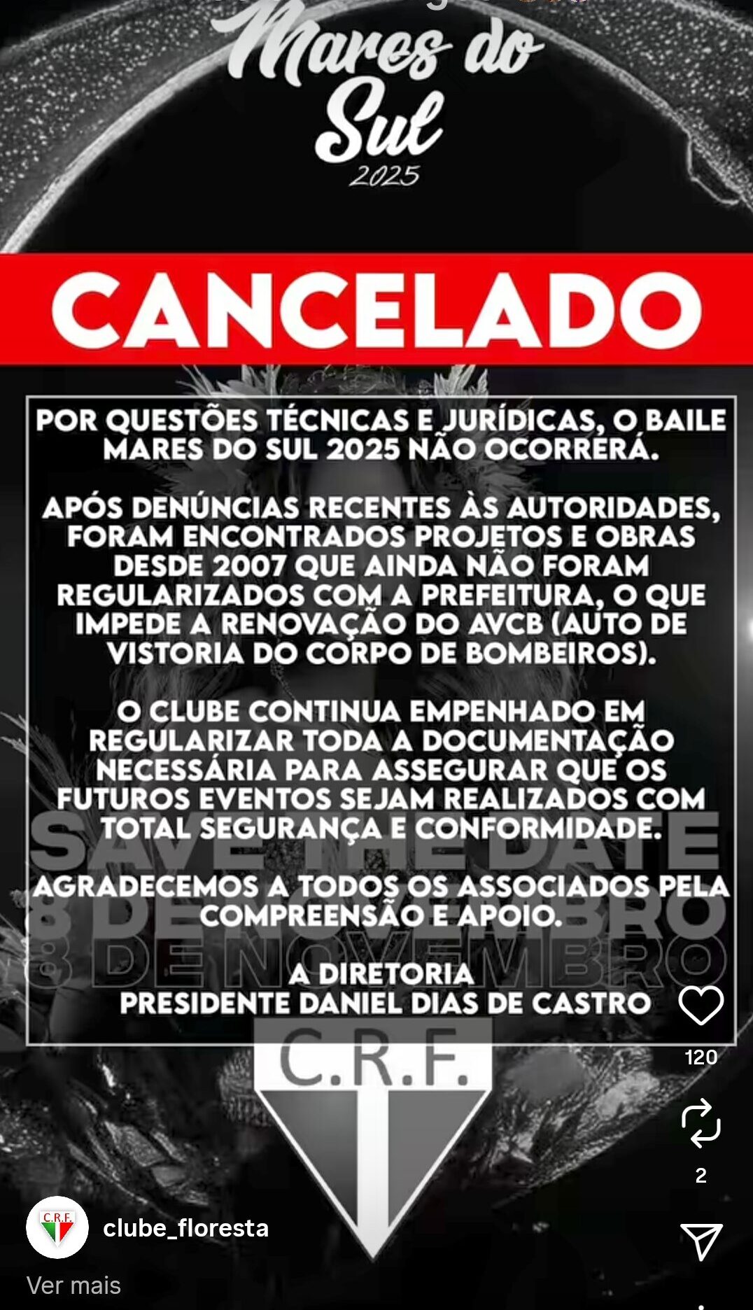 O Clube Recreativo Floresta anunciou nesta quinta (23) o cancelamento do tradicional baile “Mares do Sul 2025”, que seria realizado no dia 8 de novembro. Segundo comunicado oficial divulgado nas redes sociais do clube, o cancelamento ocorre por questões técnicas e jurídicas.
