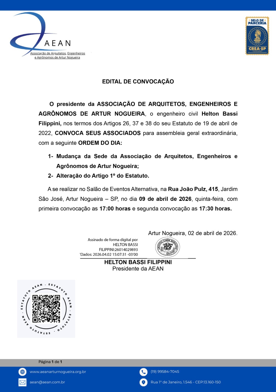A Associação de Arquitetos, Engenheiros e Agrônomos de Artur Nogueira (AEAN) divulga edital de convocação para assembleia geral extraordinária, destinada aos associados da entidade. A reunião será realizada no dia 9 de abril de 2026 (quinta-feira), no Salão de Eventos Alternativa, na Rua João Pulz, 415, no Jardim São José.