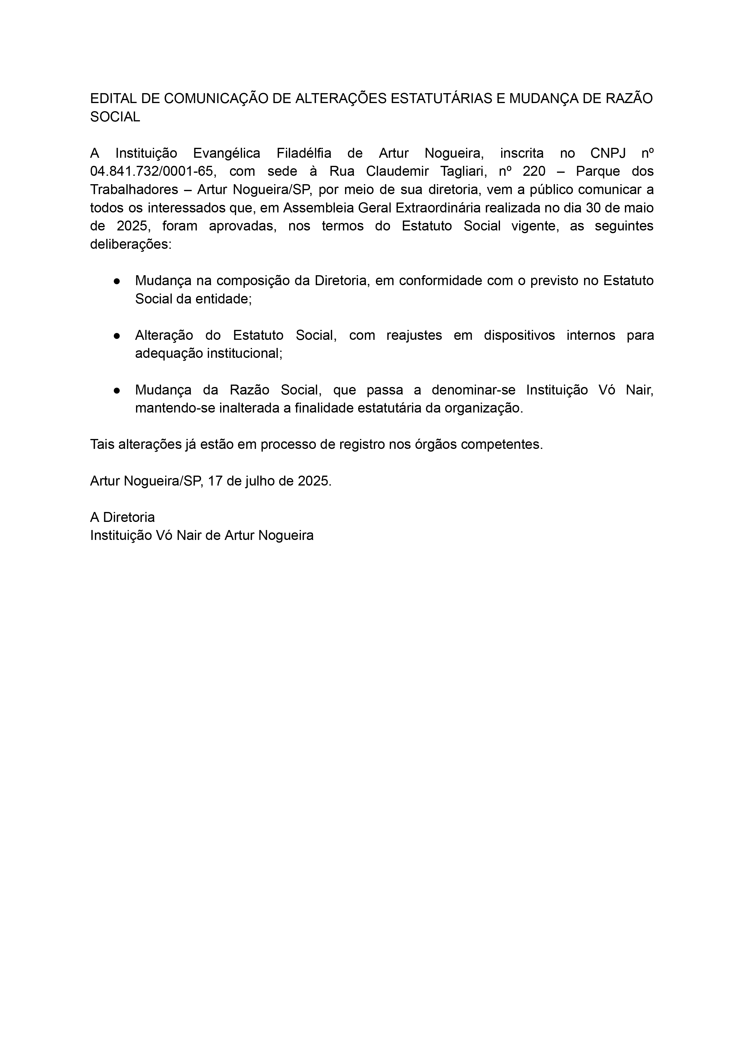 Edital de comunicação de alterações estatutárias e mudança de razão social