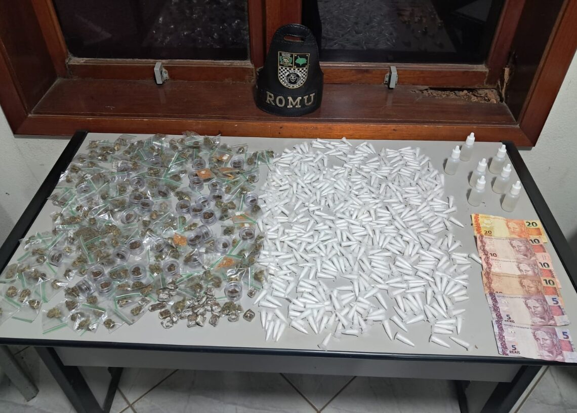 Na busca pessoal, os guardas encontraram um celular no bolso do rapaz. Dentro da bolsa, foram localizadas 294 porções de maconha, 535 porções de cocaína, 7 frascos de lança perfume e R$ 60,00 em dinheiro.