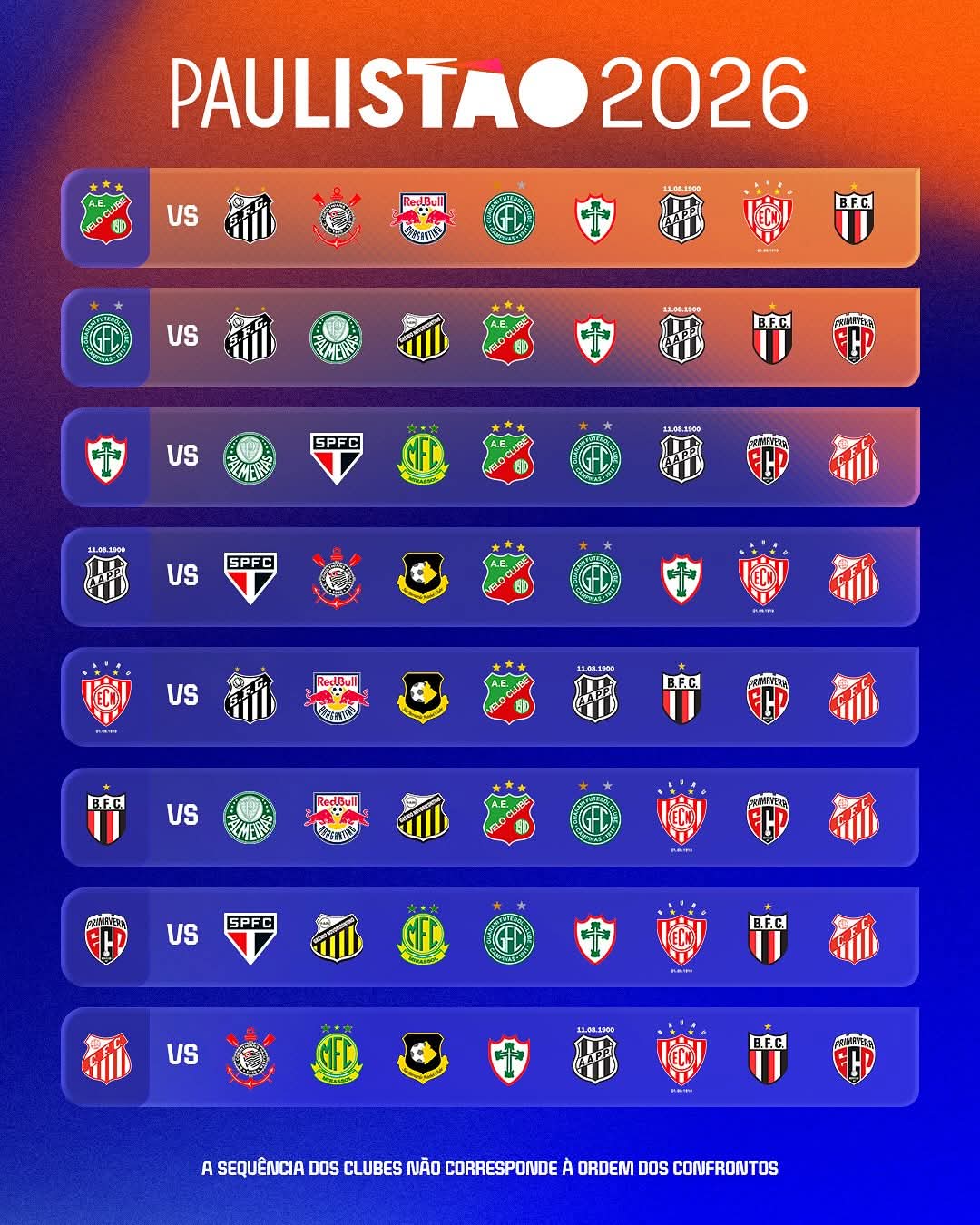 O Pote C é ocupado por Ponte Preta, Guarani, Velo Clube e Portuguesa, que terminaram a última edição entre a 9ª e a 12ª posição. E o Pote D reúne Botafogo e Noroeste, 13º e 14º colocados em 2025, e Capivariano e Primavera, que subiram do Paulistão A2.