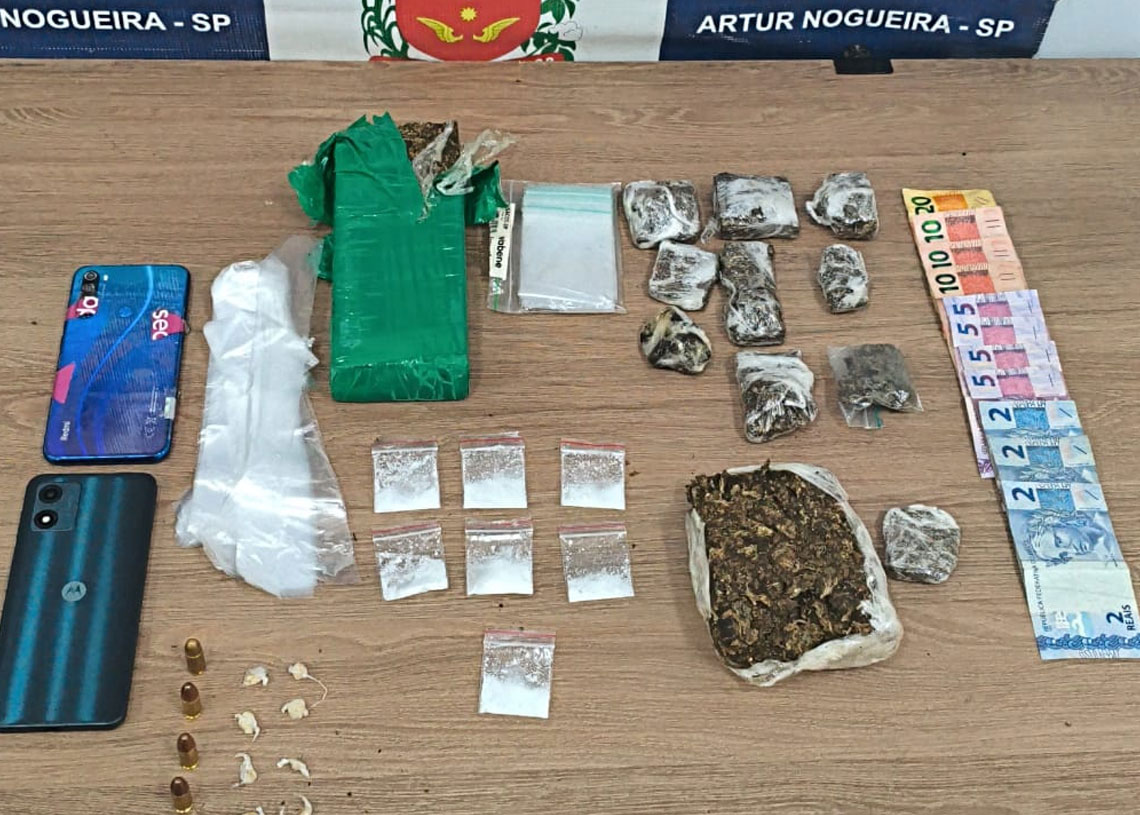 Ao todo, foram apreendidos 0,856 grama de maconha prensada, 0,260 grama de maconha colombiana, 10 pedras de crack, sete porções de cocaína, seis munições calibre 9 milímetros, dois aparelhos celulares e a quantia de R$ 76 em dinheiro.