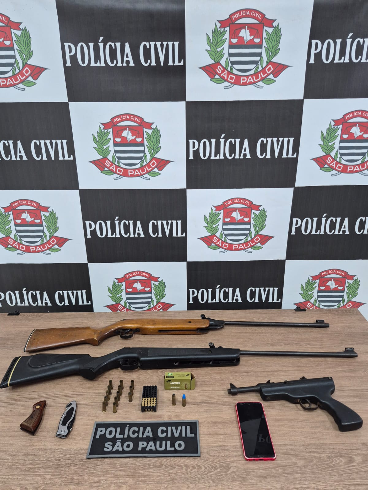 Entre os objetos apreendidos estão uma arma artesanal calibre .38, uma espingarda de pressão modificada para calibre .22, uma espingarda de pressão, munições de diversos calibres e um aparelho celular.
