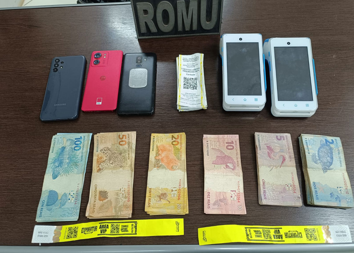 Ação da ROMU resultou na apreensão de ingressos, pulseiras VIP, celulares, máquinas de cartão e R$ 1.691,00 em dinheiro.