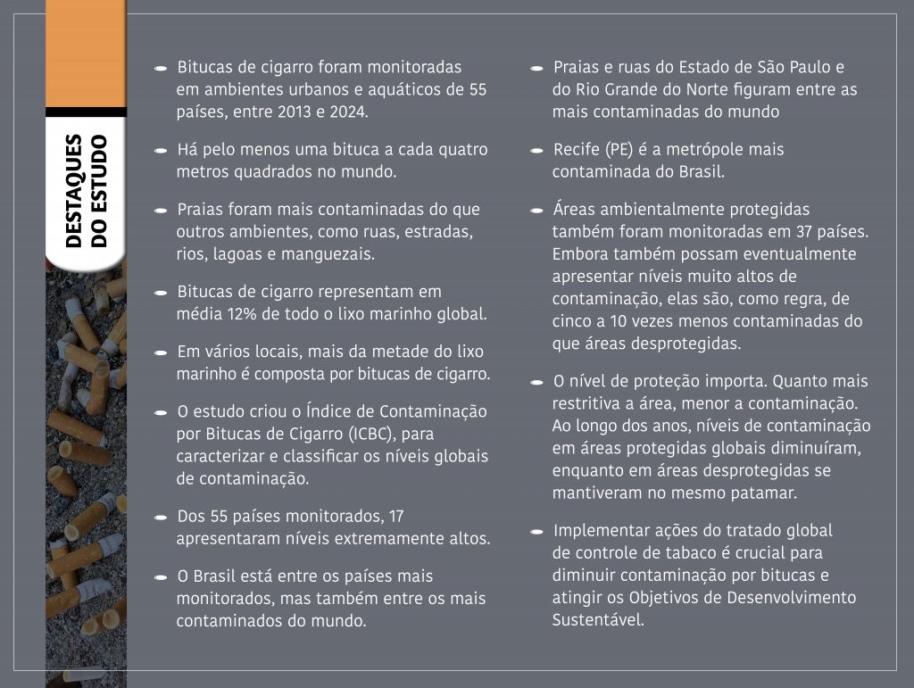 A revisão, fruto da parceria entre pesquisadores vinculados à Universidade Federal de São Paulo (Unifesp), à Universidade Estadual Paulista (Unesp), ao Instituto Nacional de Câncer (Inca), à Johns Hopkins University, nos Estados Unidos, e à Universidad San Ignacio de Loyola, no Peru, constitui a mais abrangente síntese já produzida sobre a distribuição global das bitucas e suas implicações ambientais. Artigo a respeito, tendo como primeiro autor o engenheiro ambiental Victor Vasques Ribeiro, doutorando do Instituto do Mar da Unifesp, foi publicado no periódico Environmental Chemistry Letters. Ele descreve em detalhe os padrões espaciais, os chamados hotspots de contaminação, e o efeito do grau de proteção ambiental na redução do problema.