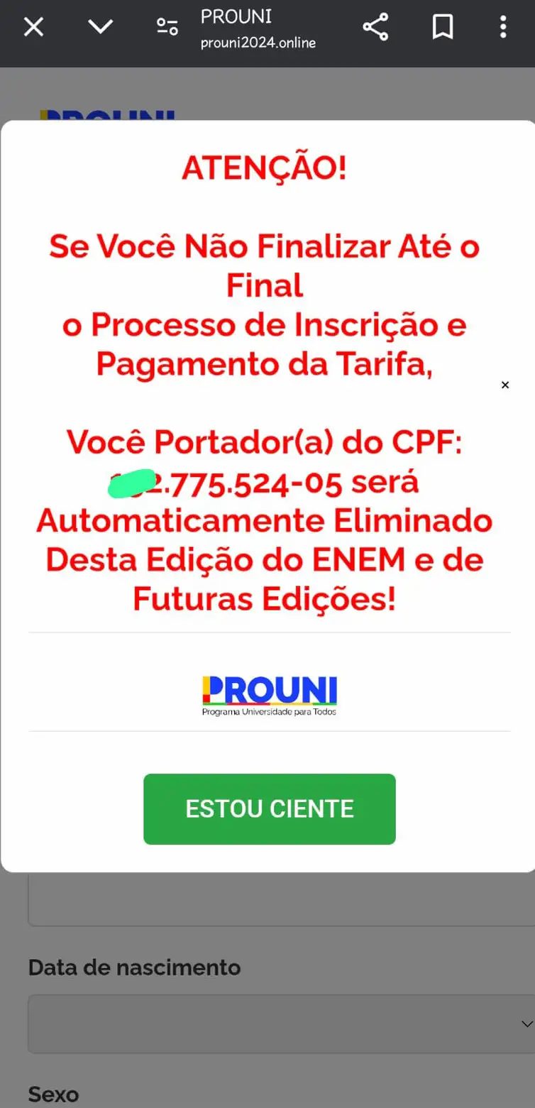 Antes de ser derrubado, o site falso solicitava a inserção de dados do candidato para então direcioná-lo a uma mensagem falsa que dizia ser necessário o pagamento da taxa de inscrição de R$ 100 para finalizar o cadastro no programa.