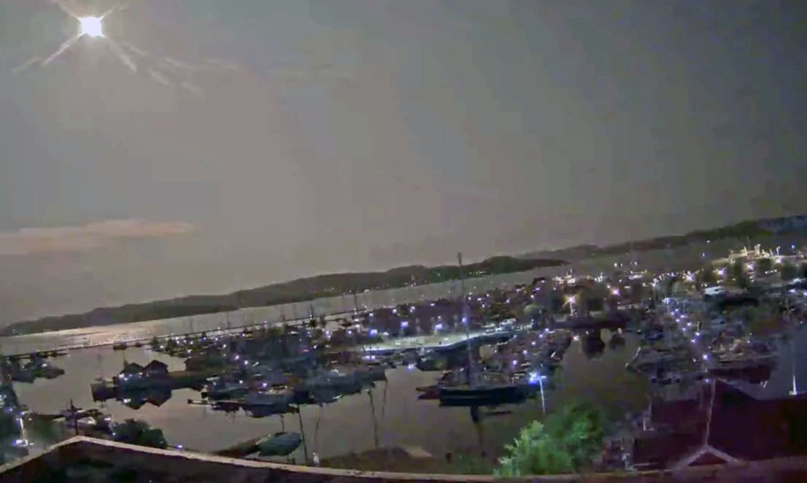 Uma câmera em Holmestrand, ao sul de Oslo, capturou uma bola de fogo caindo do céu e explodindo em um flash brilhante iluminando uma marina.