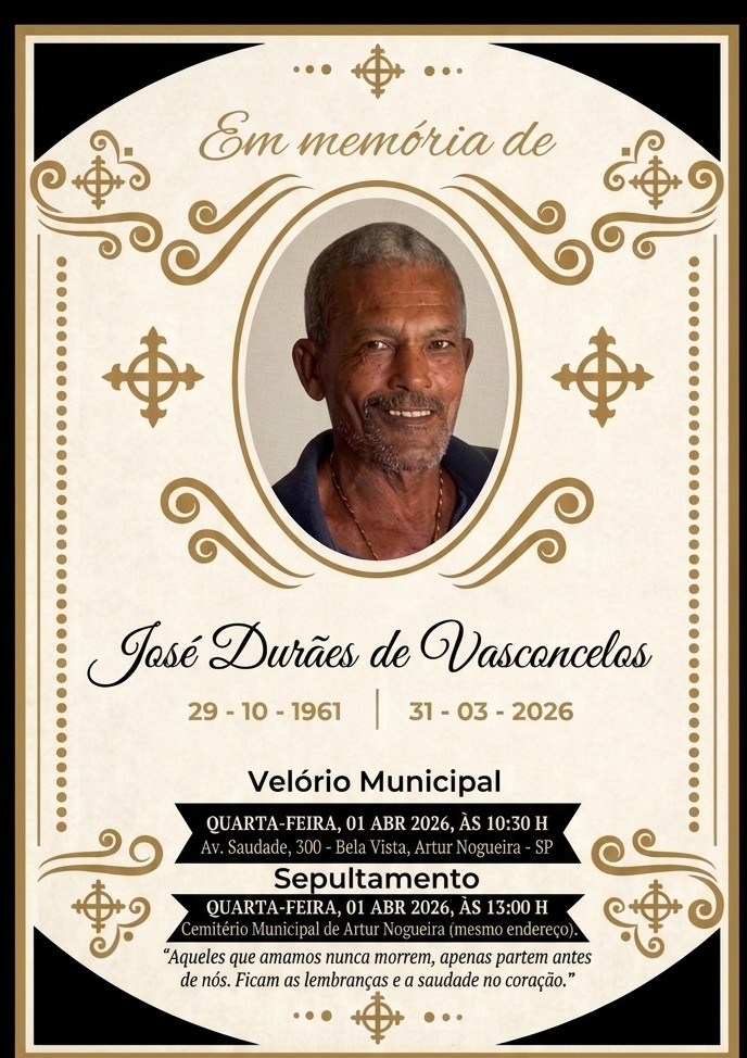 Faleceu nesta terça-feira (31), às 16h52, o morador de Artur Nogueira, José Durães Vasconcelos, aos 64 anos de idade.