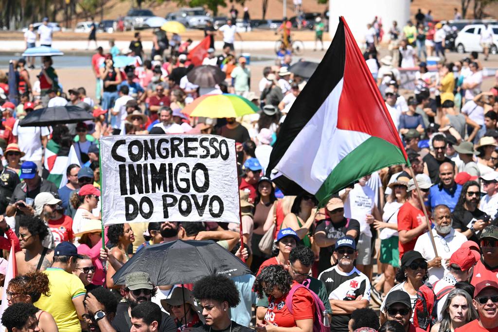 Com o mote “Congresso Inimigo do Povo”, os manifestantes exigiram a prisão do ex-presidente Jair Bolsonaro, condenado a 27 anos de prisão por tentativa de golpe de Estado, organização criminosa, entre outros crimes.