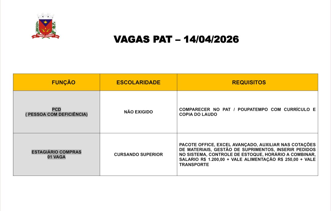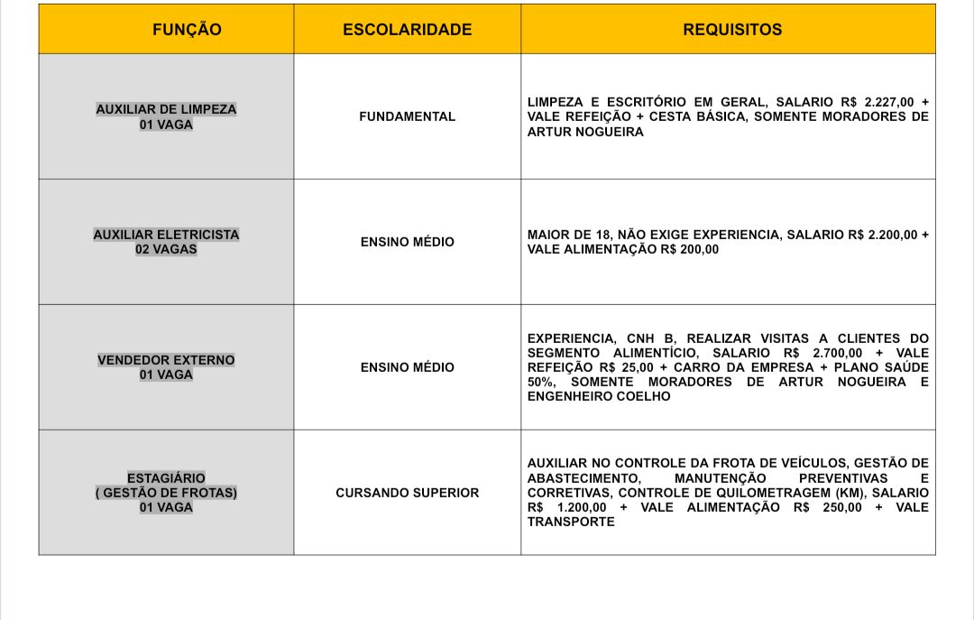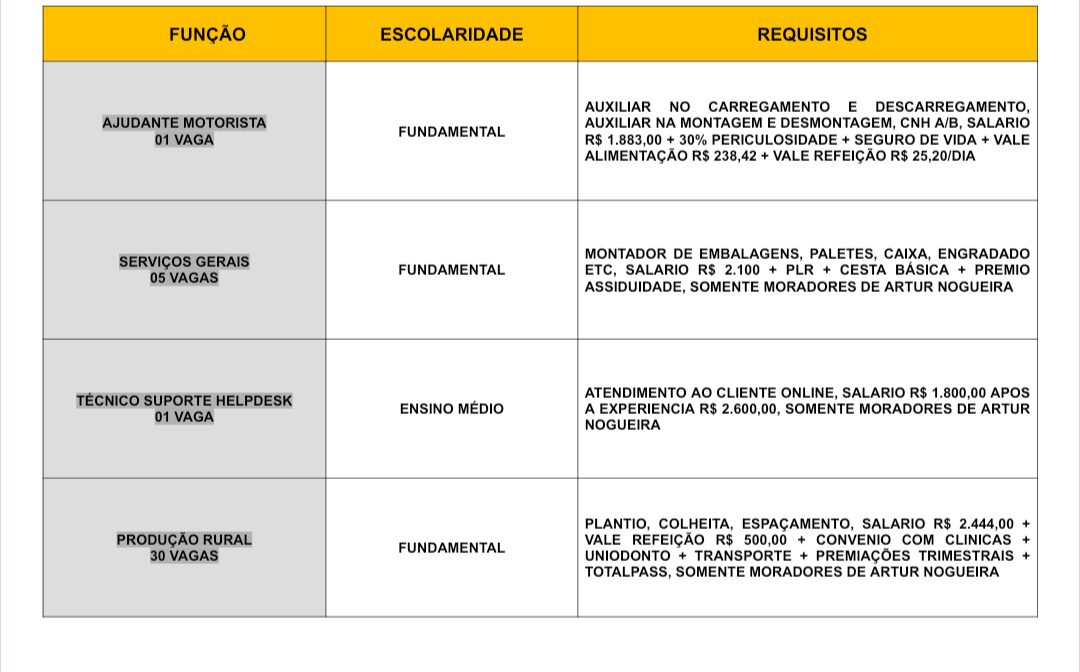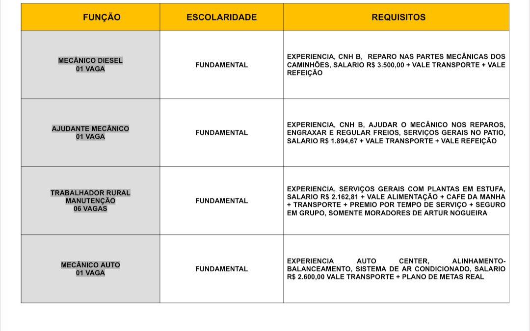 Novas vagas de emprego foram divulgadas pelo Posto de Atendimento ao Trabalhador (PAT) de Artur Nogueira.