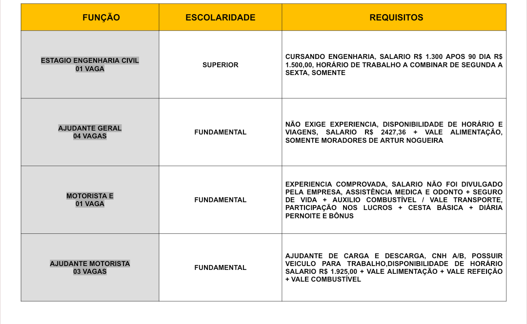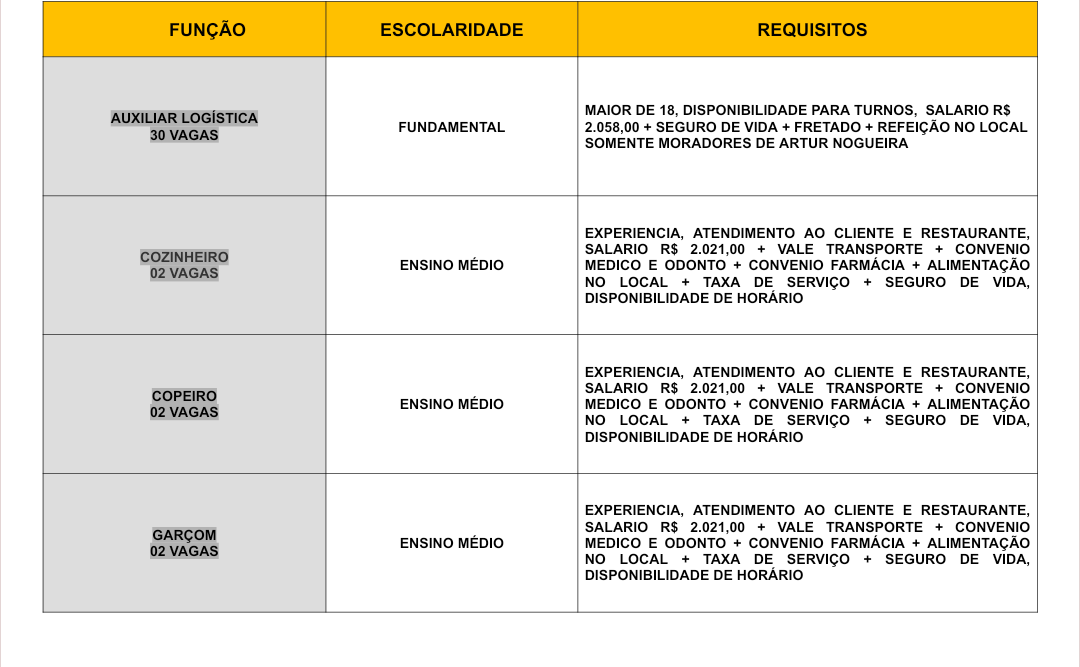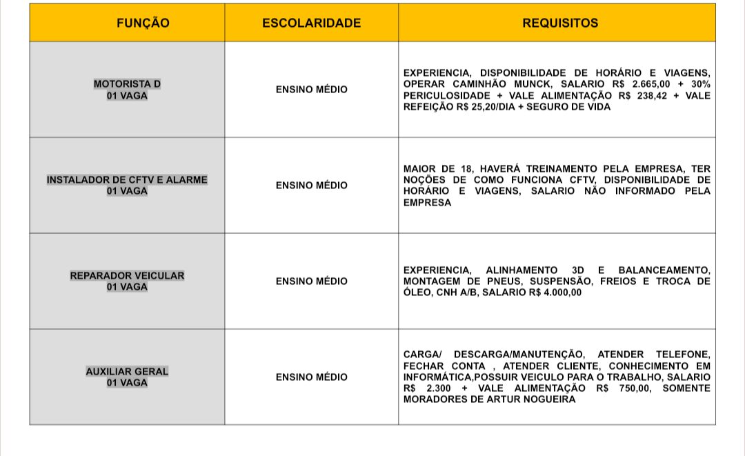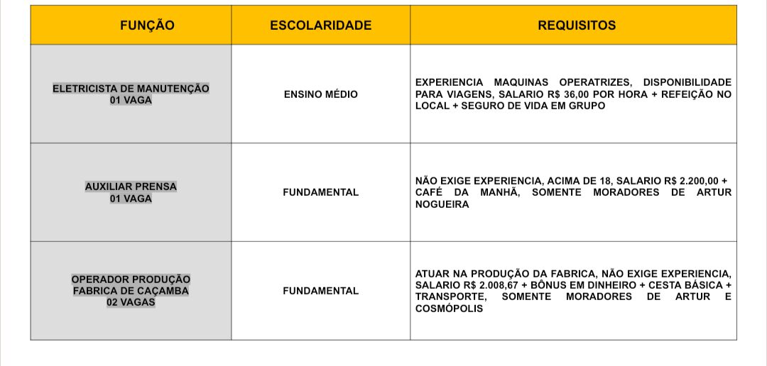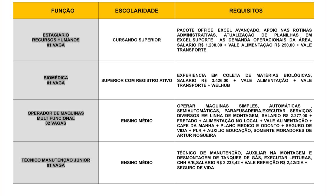 Novas vagas de emprego foram divulgadas pelo Posto de Atendimento ao Trabalhador (PAT) de Artur Nogueira.