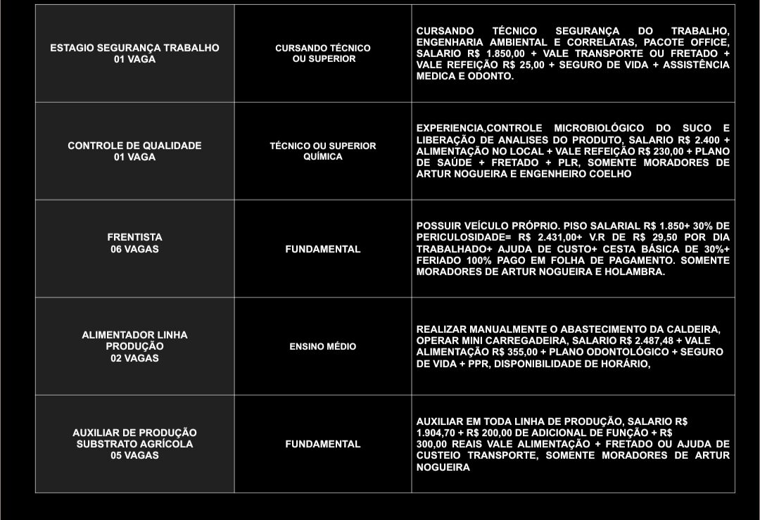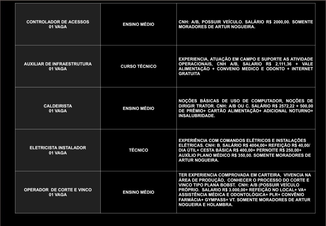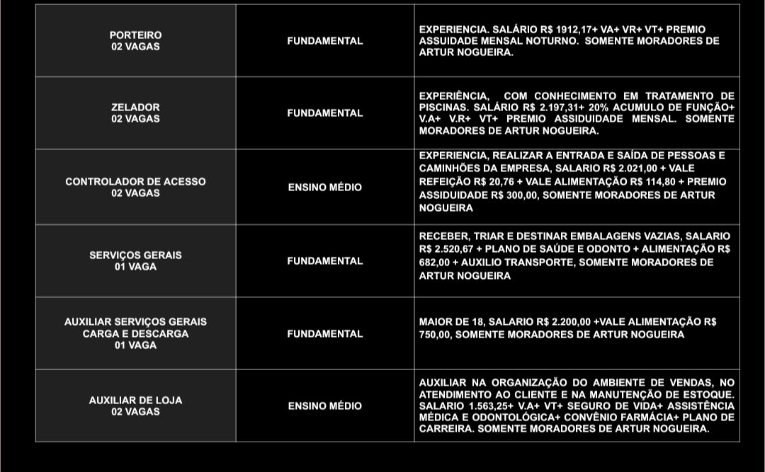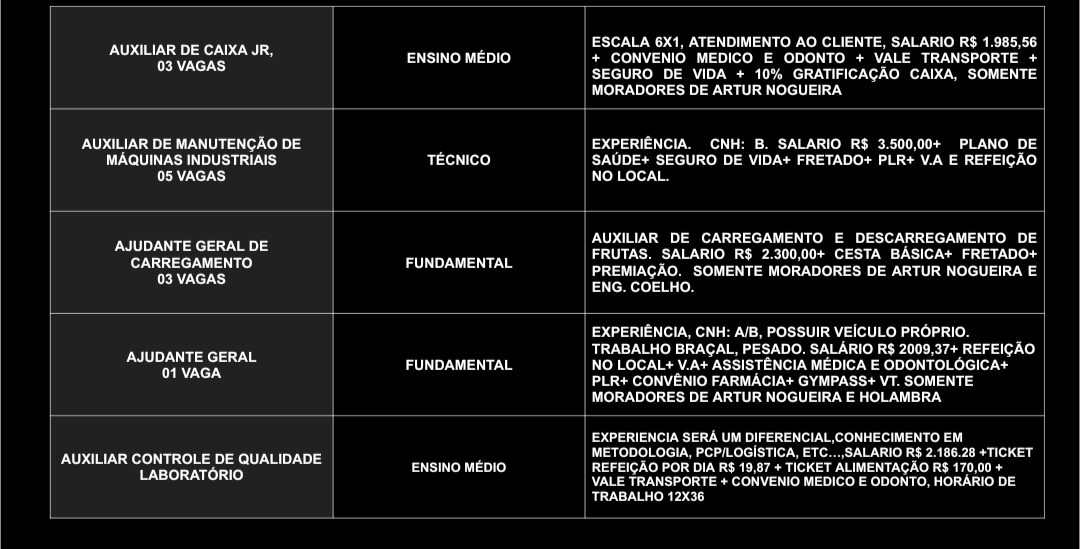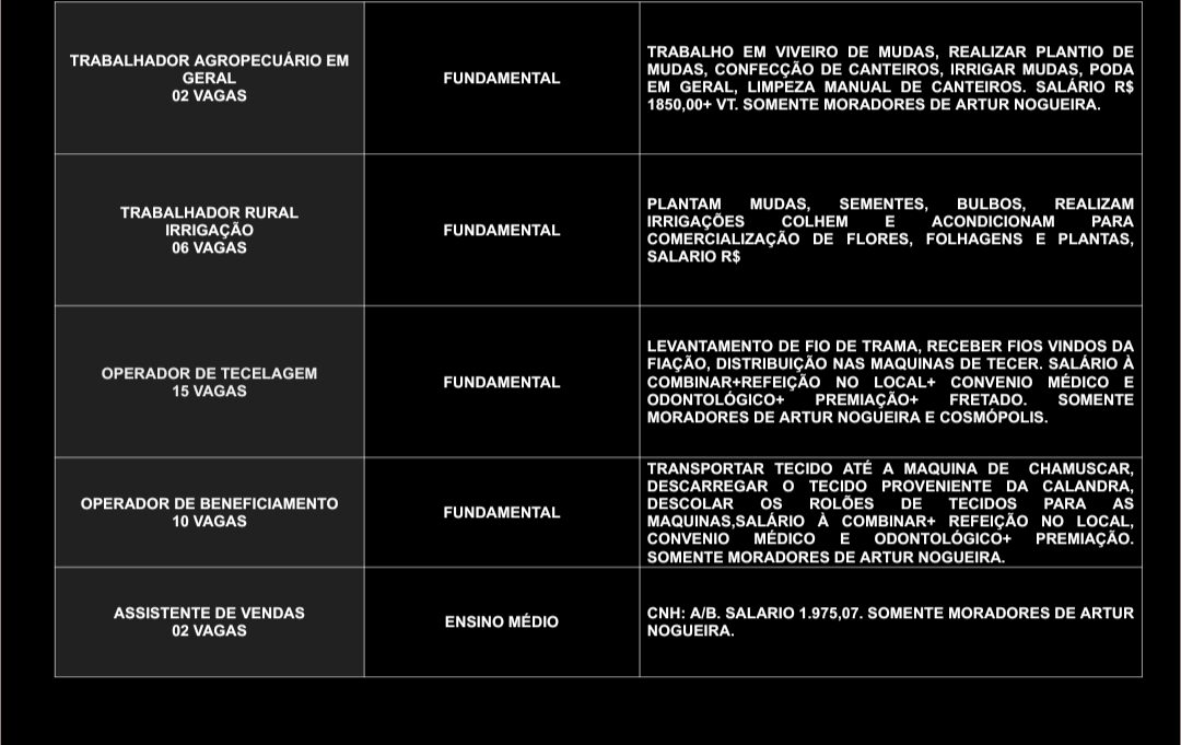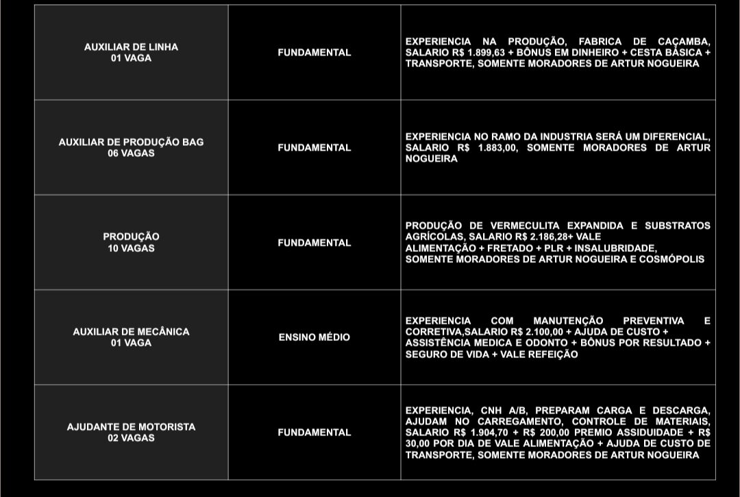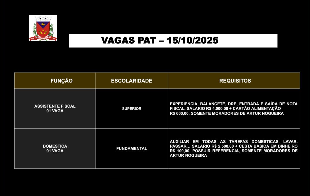 O Posto de Atendimento ao Trabalhador (PAT) de Artur Nogueira divulgou novas oportunidades de emprego nesta quarta-feira (15). As vagas contemplam profissionais de diversos níveis de escolaridade, desde o ensino fundamental até o superior, em diferentes áreas de atuação.