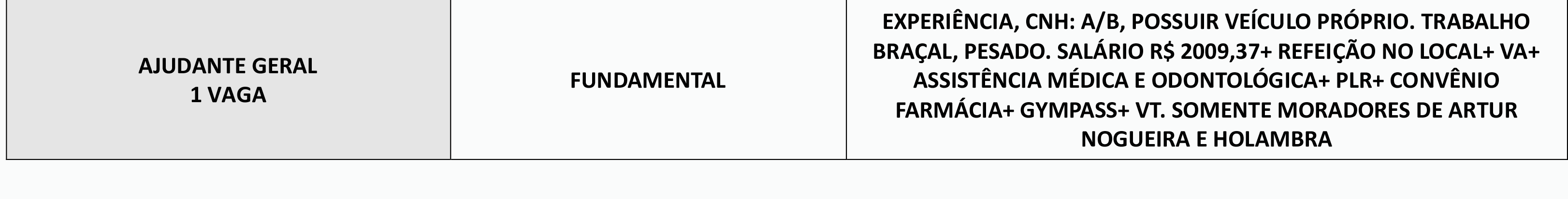 Frentista – 6 vagas, fundamental completo, com salário de R$ 2.431,00 (já com adicional de periculosidade) mais benefícios. Vagas exclusivas para moradores de Artur Nogueira e Holambra.