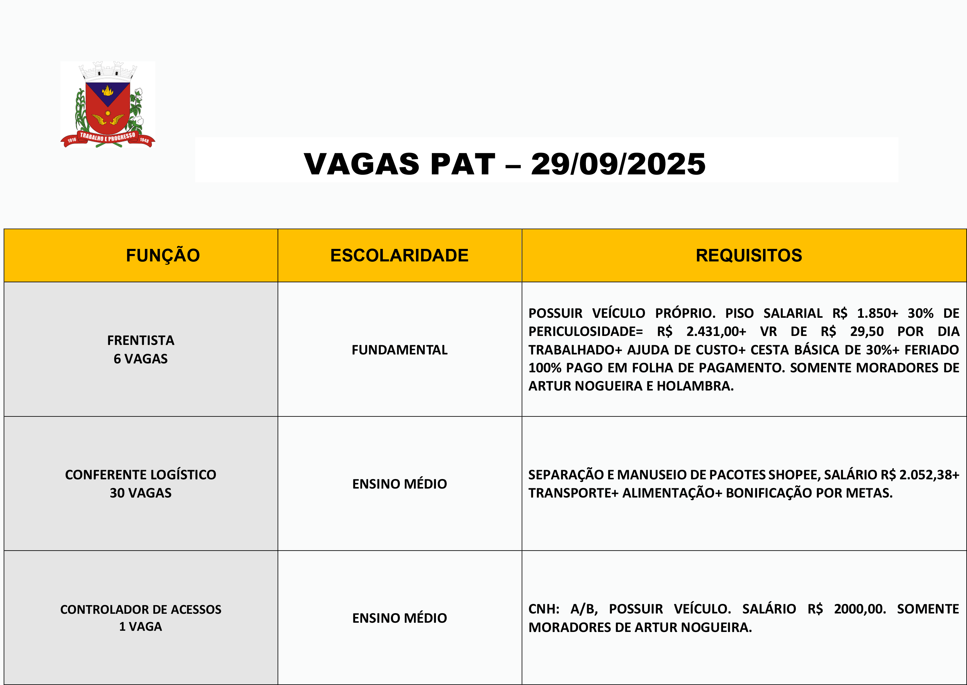 O Posto de Atendimento ao Trabalhador (PAT) de Artur Nogueira atualizou, nesta segunda-feira (29), a lista de vagas de emprego disponíveis. As oportunidades abrangem funções operacionais, técnicas e administrativas, com exigências que vão desde o ensino fundamental até nível superior.
