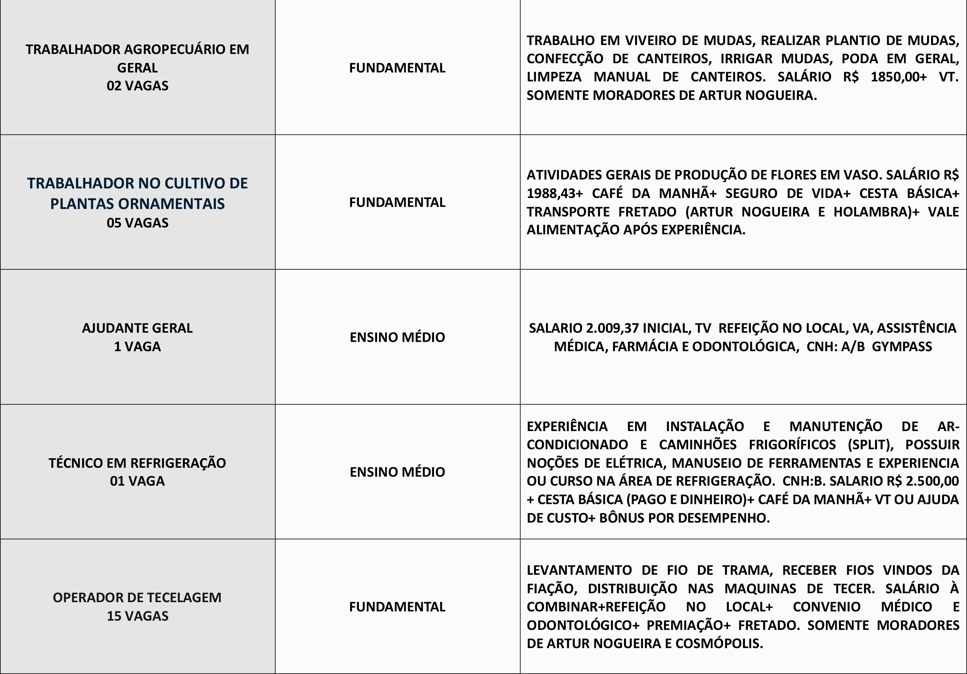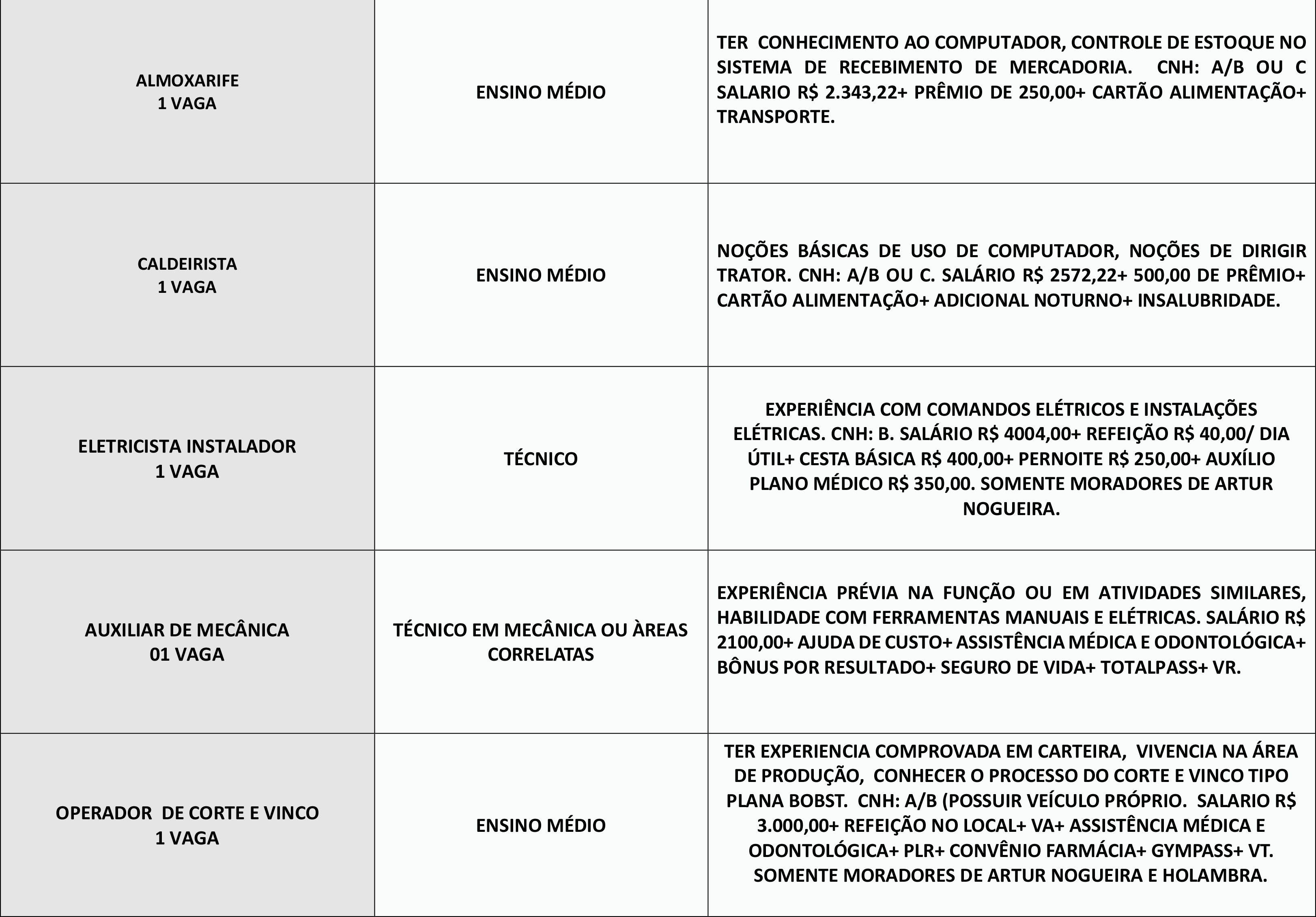 Além dessas, há vagas para controlador de acessos, almoxarife, caldeirista, auxiliar de mecânica, operador de corte e vinco, trabalhador agropecuário, ajudante geral, técnico em refrigeração, eletricista, analista de processos produtivos, topógrafo, porteiro, zelador, caldeireiro, magarefe, ajudante de mecânico, auxiliar de loja, estoquista, entregador, auxiliar de manutenção de máquinas industriais, ajudante geral de carregamento, embalador, pintor industrial, operador de redes, balconista, estagiário, garçom e trabalhador da manutenção de edificações.
