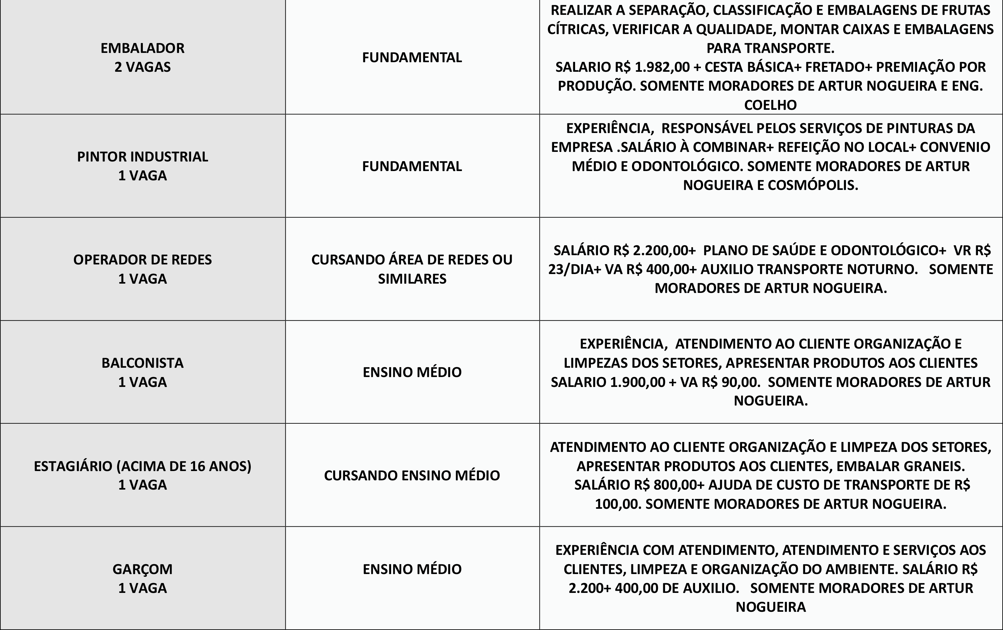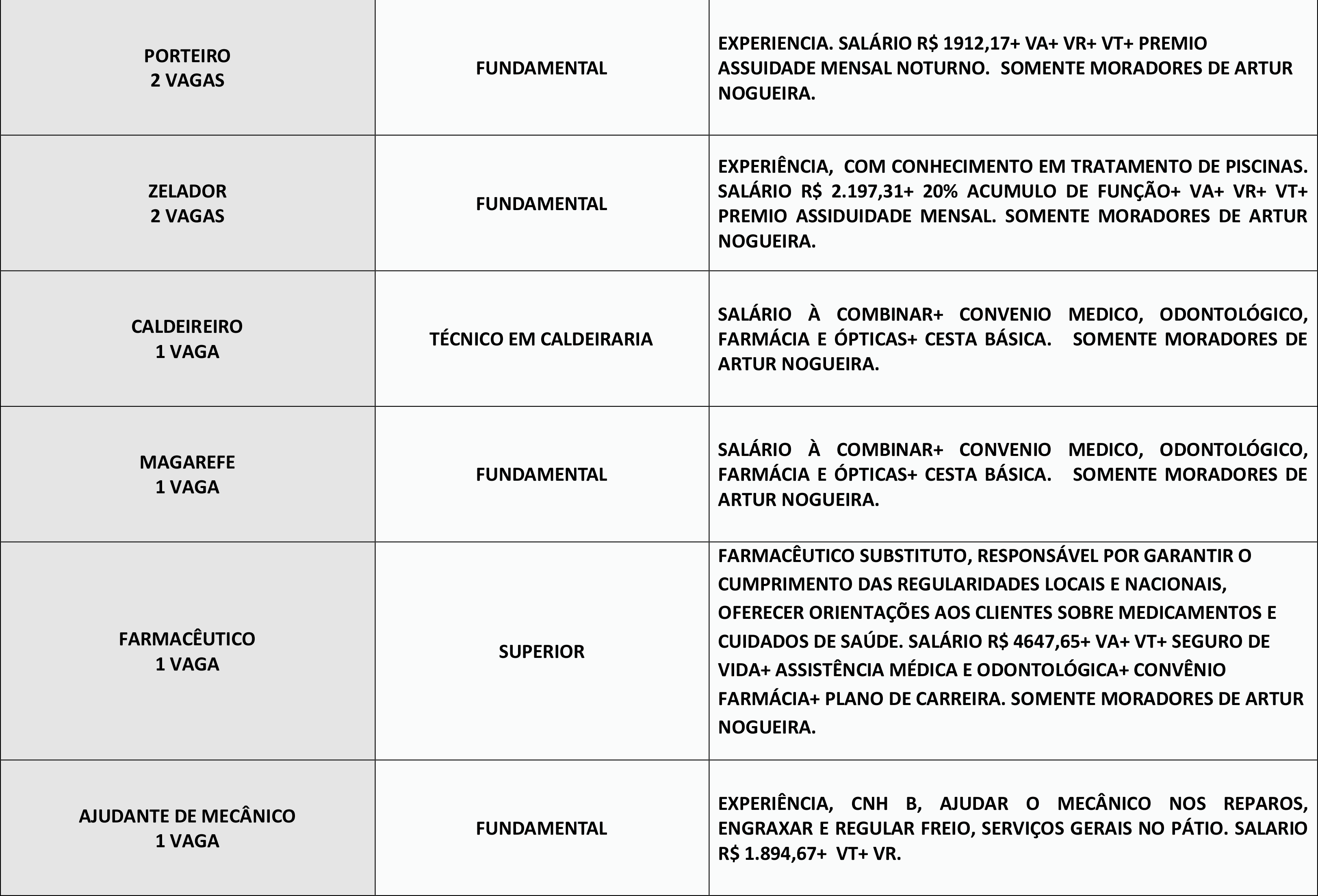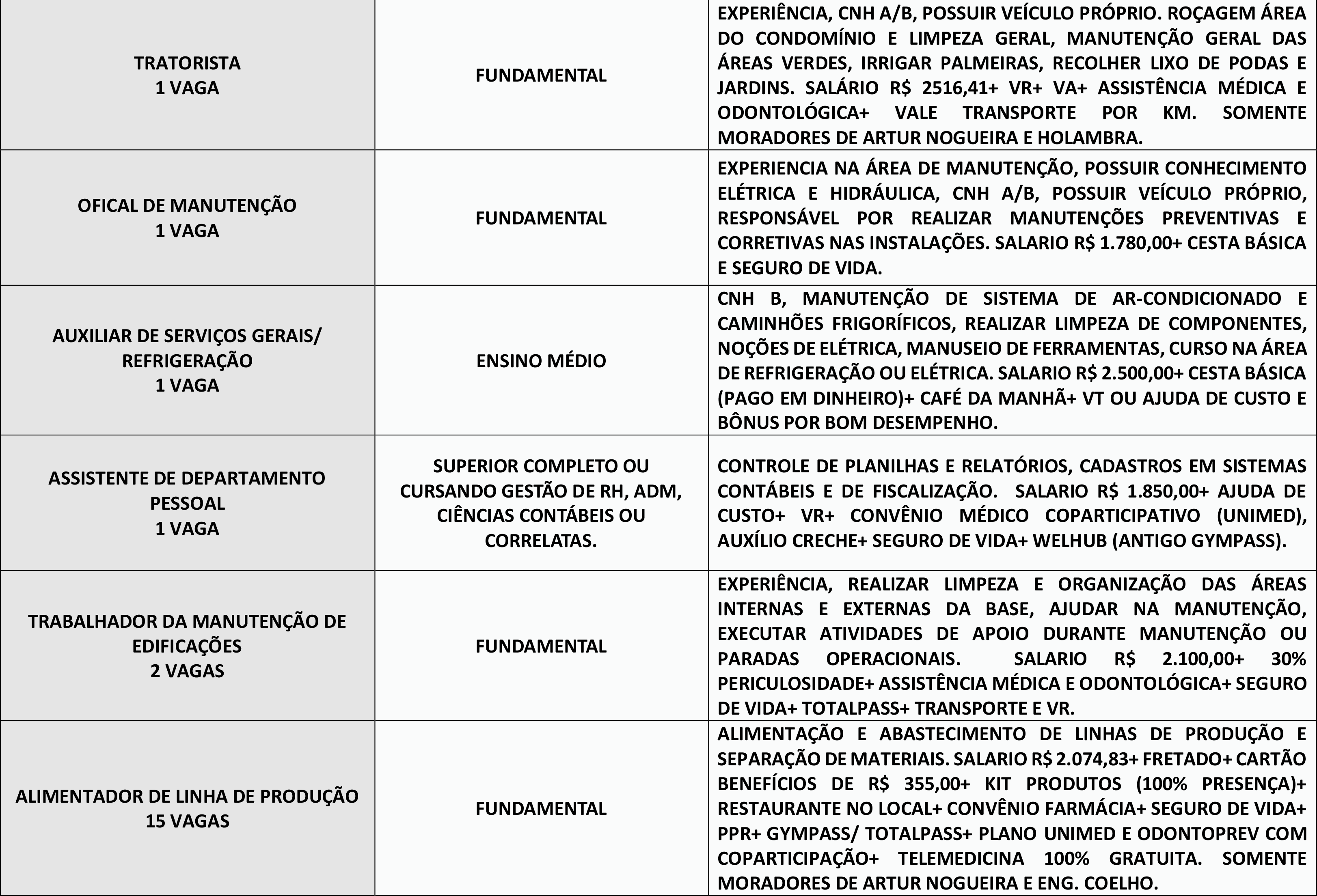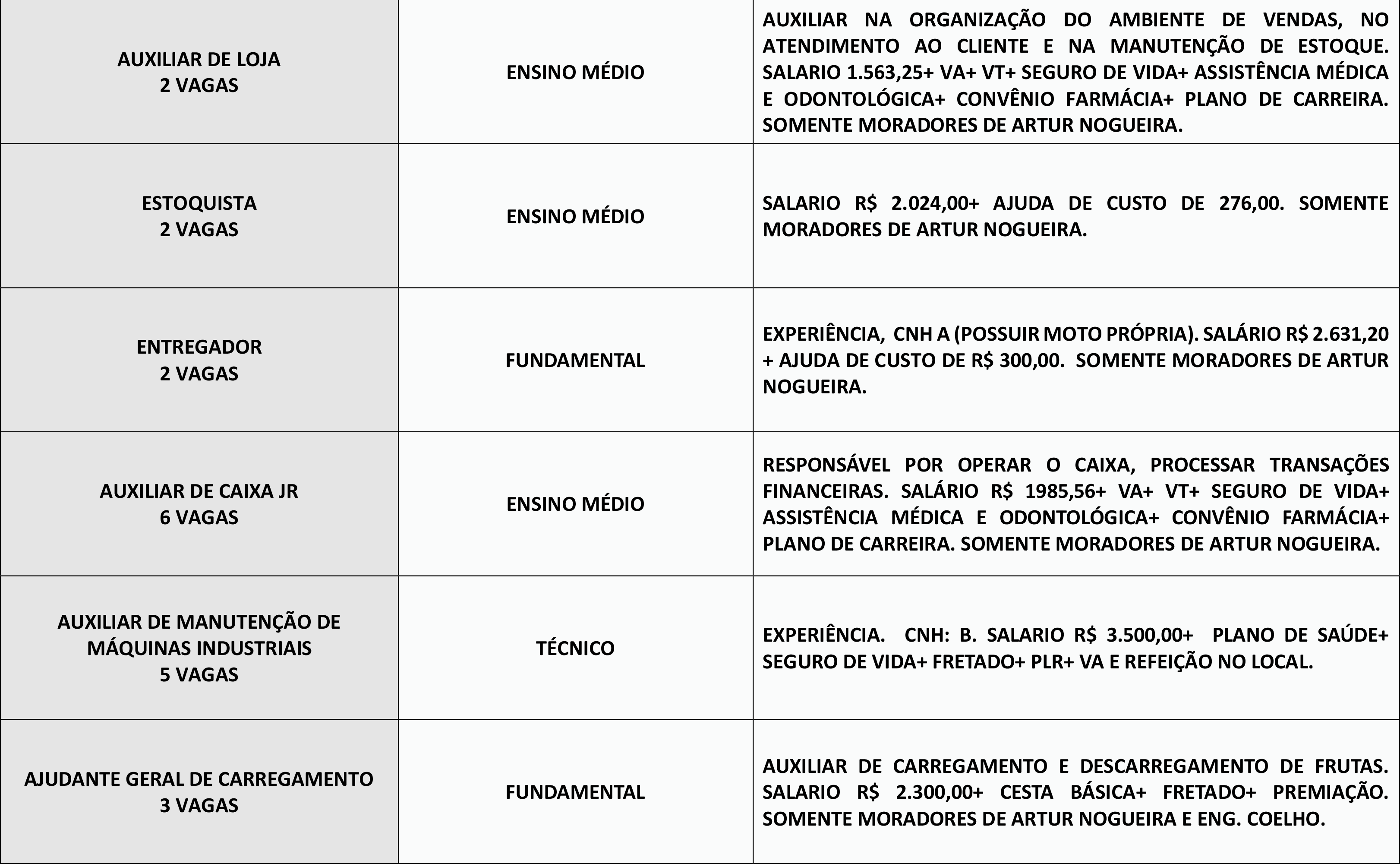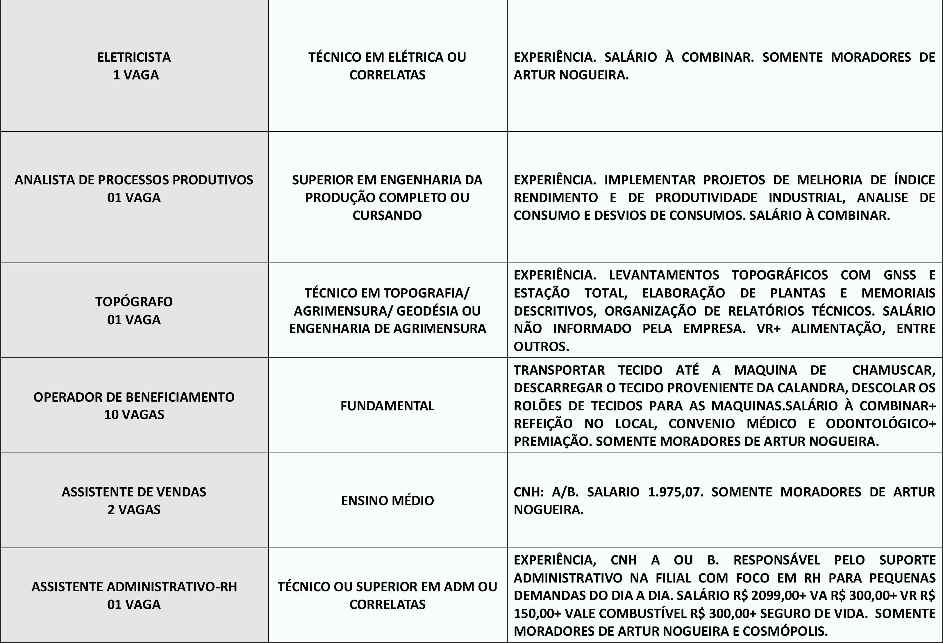 Frentista – 6 vagas, fundamental completo, com salário de R$ 2.431,00 (já com adicional de periculosidade) mais benefícios. Vagas exclusivas para moradores de Artur Nogueira e Holambra.