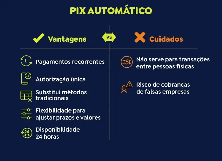 O Pix automático traz alguns riscos de segurança. O principal são falsas empresas que enviam propostas de cobrança que irão para contas de terceiros. Para minimizar o risco de golpes, o BC editou, em junho, uma série de normas para as empresas que aderirem ao Pix automático.