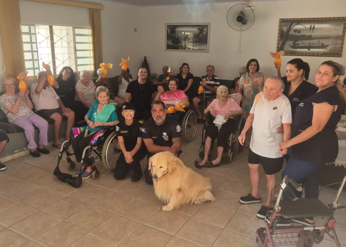 A ação aconteceu por meio do Projeto Guarda Pet Terapia, desenvolvido pela Guarda Civil Municipal, e proporcionou um momento de alegria, acolhimento e interação aos participantes. Estiveram presentes o subcomandante Heder, o inspetor Carneiro, a guarda mirim Helena, a diretora de Assistência Social Lourriê Capatto e o cão Luck – que encantou os idosos durante a visita.