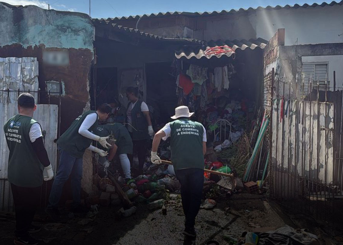A equipe dos veterores esteve no local inicialmente para a realização de um bloqueio sanitário, em razão da confirmação de um caso positivo de dengue na região. Durante a vistoria, foi constatado que a moradora se encontrava em situação de acumulação, com grande quantidade de lixo e entulho armazenados no interior do imóvel.