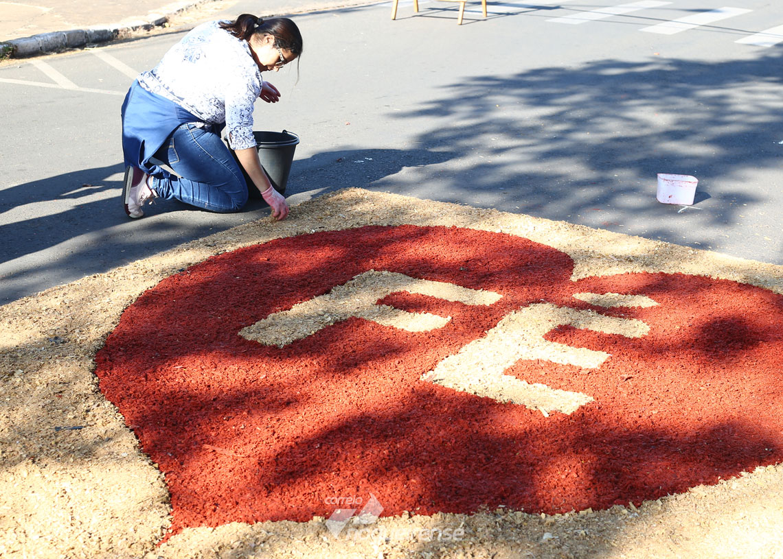 Centenas de pessoas se reuniram na manhã desta quinta-feira (20) para confeccionar os tapetes coloridos utilizando serragem e outros materiais. Imagens bíblicas são reproduzidas em celebração a eucaristia instituída.