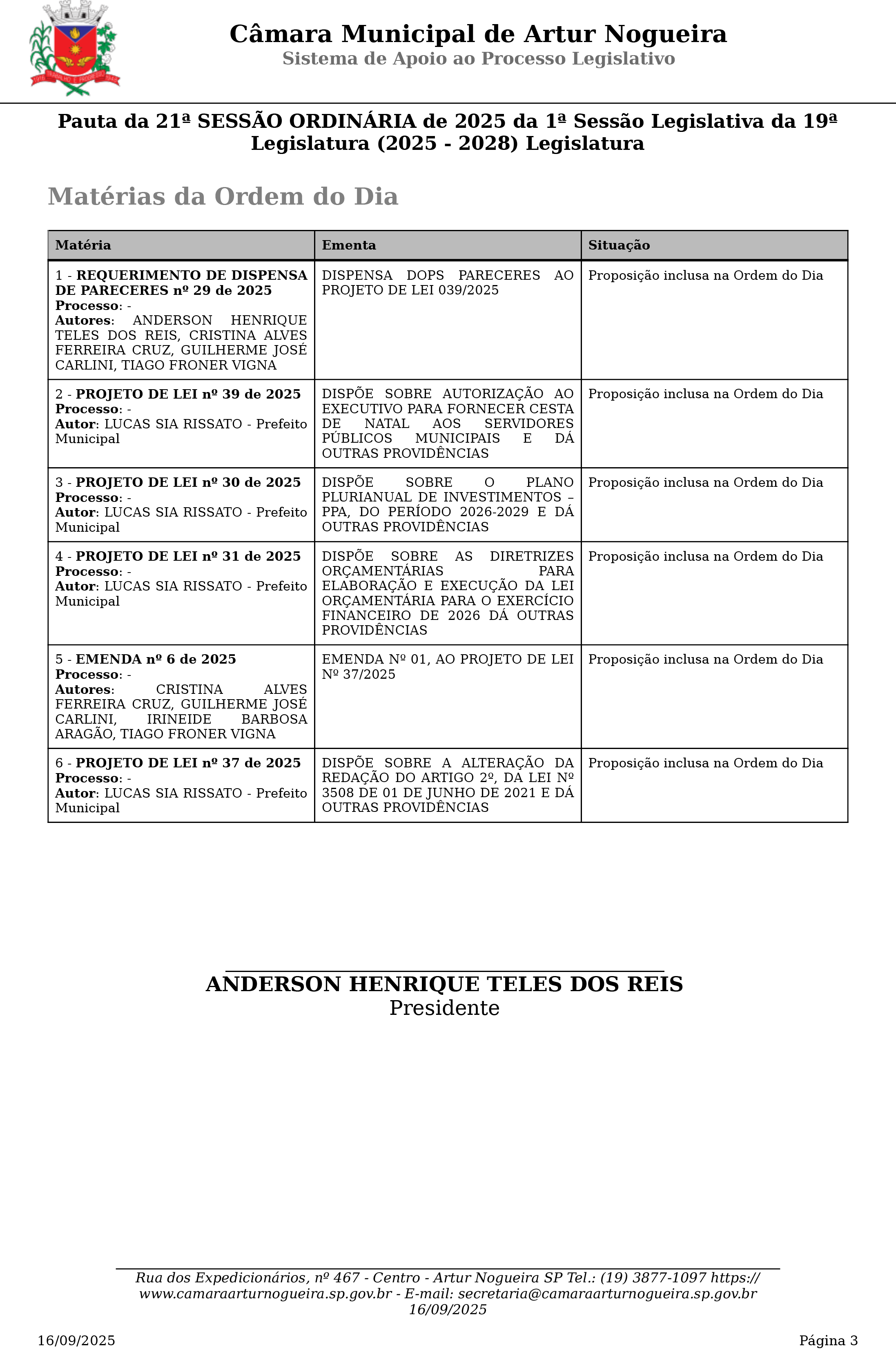 A Câmara Municipal de Artur Nogueira realiza nesta terça-feira (16), às 18h30, a 21ª sessão ordinária de 2025. O encontro, que foi transferido devido ao feriado de Nossa Senhora das Dores, acontece no plenário localizado na Rua dos Expedicionários, nº 467, no Centro da cidade, com transmissão ao vivo pelo Correio Nogueirense.