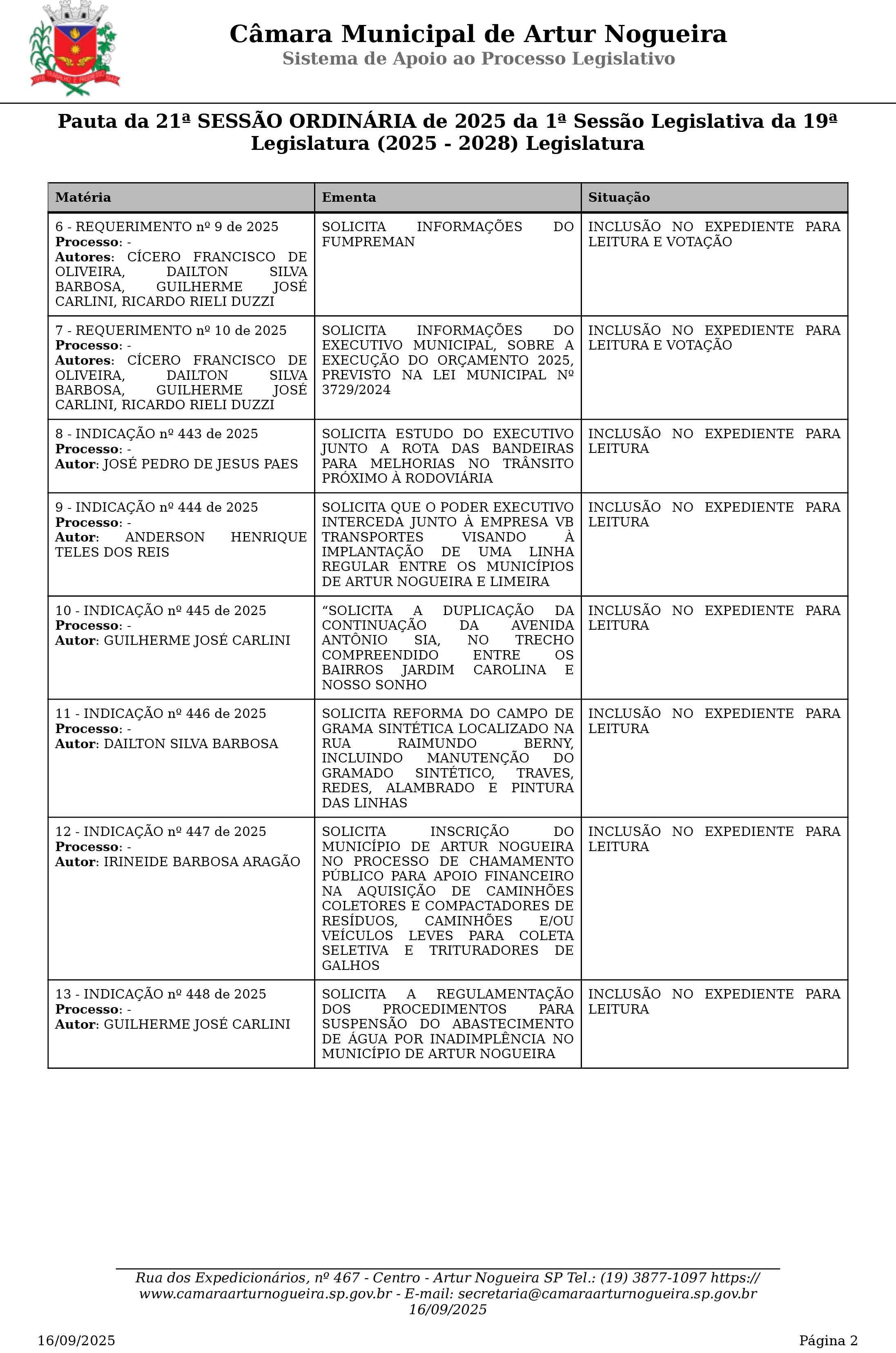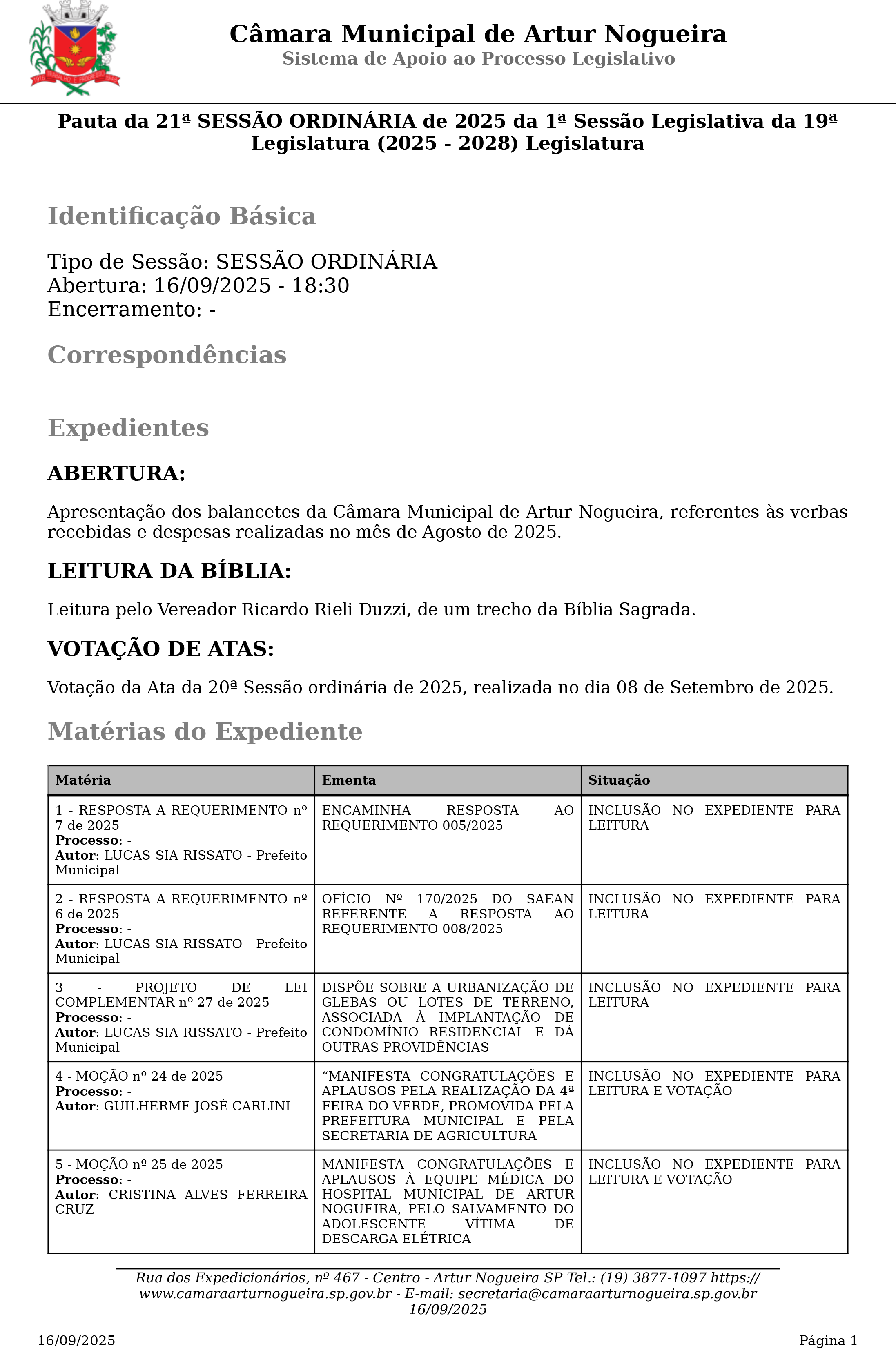 A Câmara Municipal de Artur Nogueira realiza nesta terça-feira (16), às 18h30, a 21ª sessão ordinária de 2025. O encontro, que foi transferido devido ao feriado de Nossa Senhora das Dores, acontece no plenário localizado na Rua dos Expedicionários, nº 467, no Centro da cidade, com transmissão ao vivo pelo Correio Nogueirense.