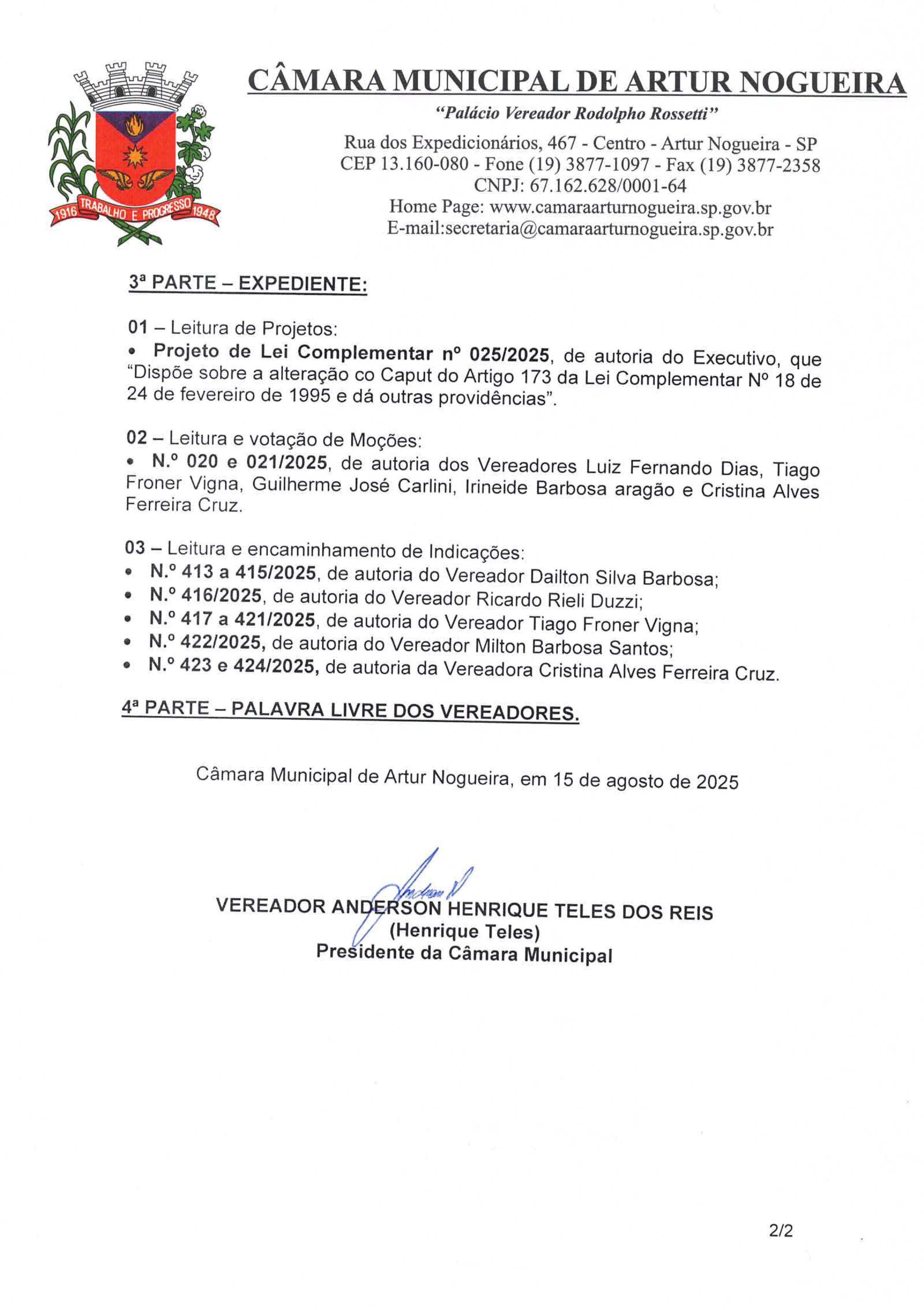 Na fase do expediente, será lido o Projeto de Lei Complementar nº 025/2025, que altera o Caput do Artigo 173 da Lei Complementar nº 18/1995. Também estão previstas moções de reconhecimento apresentadas pelos vereadores Luiz Fernando Dias, Tiago Vigna, Guilherme Carlini, Irineide Barbosa Aragão e Cristina Alves Cruz, além do encaminhamento de indicações feitas por diferentes parlamentares.