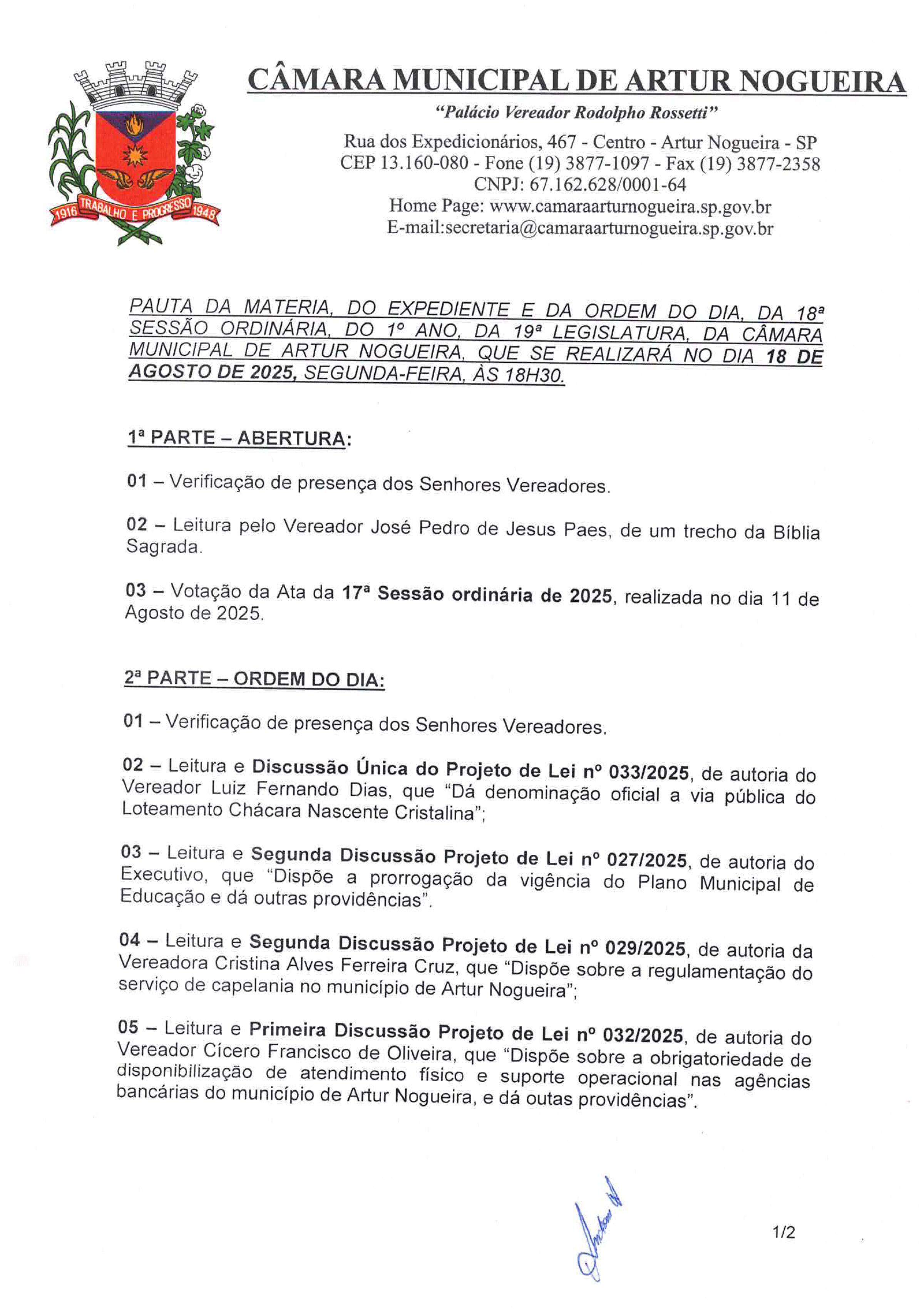 A Câmara Municipal de Artur Nogueira realiza nesta segunda-feira (18), às 18h30, a 18ª sessão ordinária. O encontro acontece no plenário “Vereador Rodolpho Rossetti”, localizado na Rua dos Expedicionários, nº 467, no Centro da cidade, e será transmitido ao vivo pelo Correio Nogueirense.