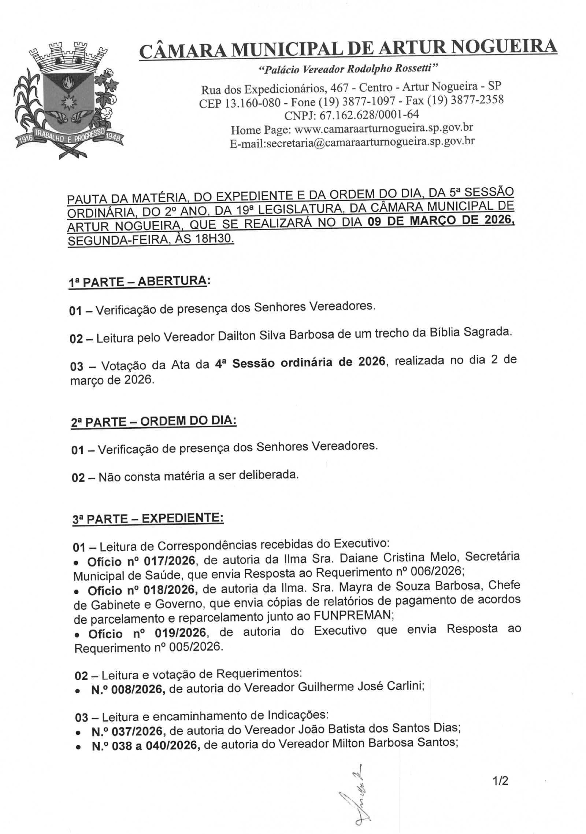 A Câmara Municipal de Artur Nogueira realiza nesta segunda-feira (9), às 18h30, a 5ª Sessão de 2026. A reunião acontecerá no plenário do Legislativo e é aberta à participação da população. O Correio Nogueirense também transmitirá ao vivo.
